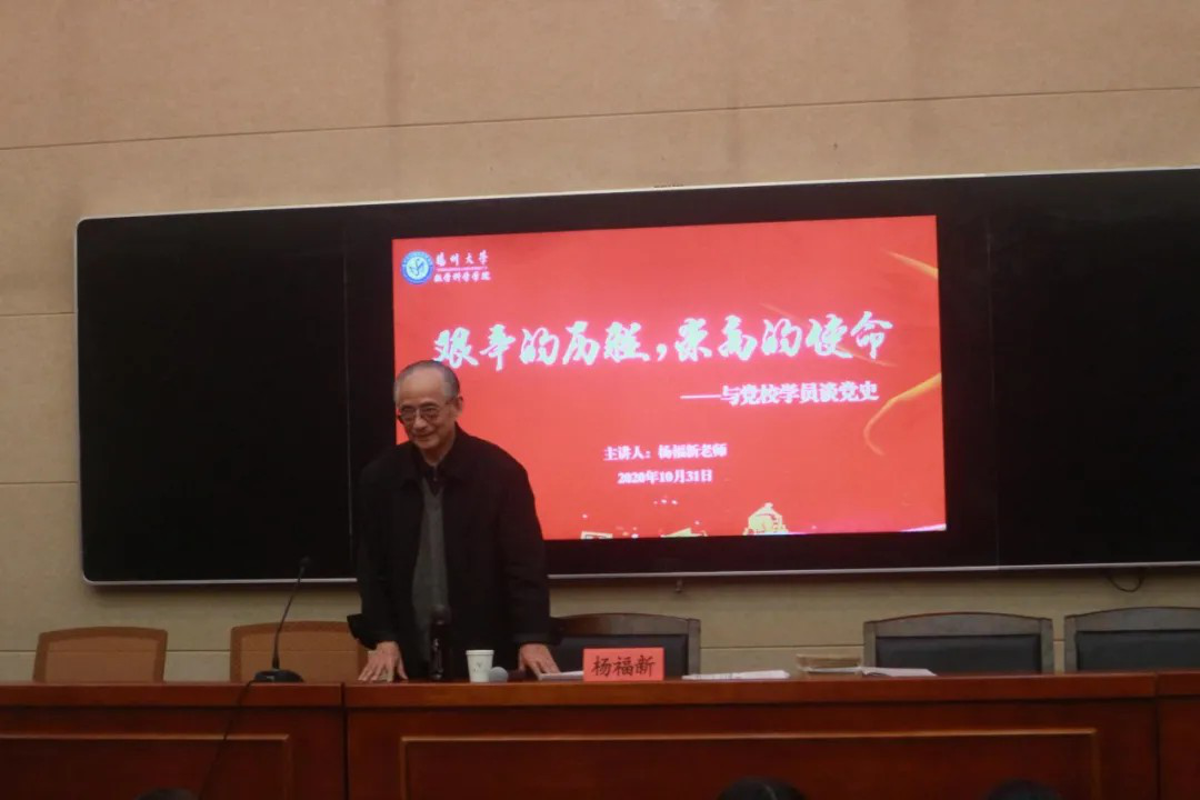 我院邀请杨福新老师为2020级全体新生开展“党史”讲座。据了解,杨福新老师已有60余年党龄,杨福新老师从自身入党经历出发,引导学生,了解党的宗旨、性质以及全心全意为人民服务的精神。以中国共产党的成立,红军长征,新中国成立等历史事件微入口,以“中共领导亿万民众经历千难万险推翻三座大山,建立起新中国、中共遵义会议”三个方面,引导学生了解中国共产党百余年的历史和党内成员的艰苦奋斗、舍身为国、不怕牺牲的精神,不断传递着我党的先锋形象。