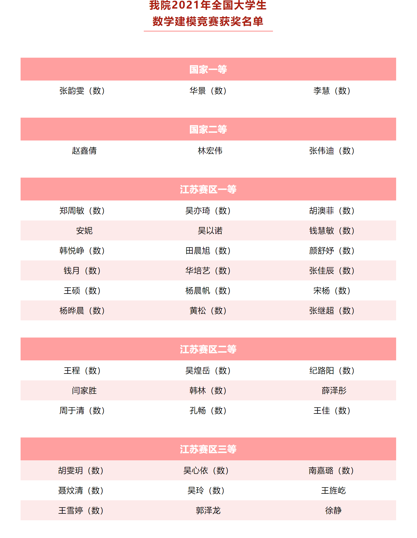 2021年全国大学生数学建模竞赛已经顺利结束,我校共派出55个队(包括广陵学院2个队)参赛。今年我校此项赛事成绩出色,斩获国家一等奖1项(全省22项),国家二等奖3项;江苏省一等奖8项,江苏省二等奖4项,江苏省三等奖9项,获奖比例45.5%。