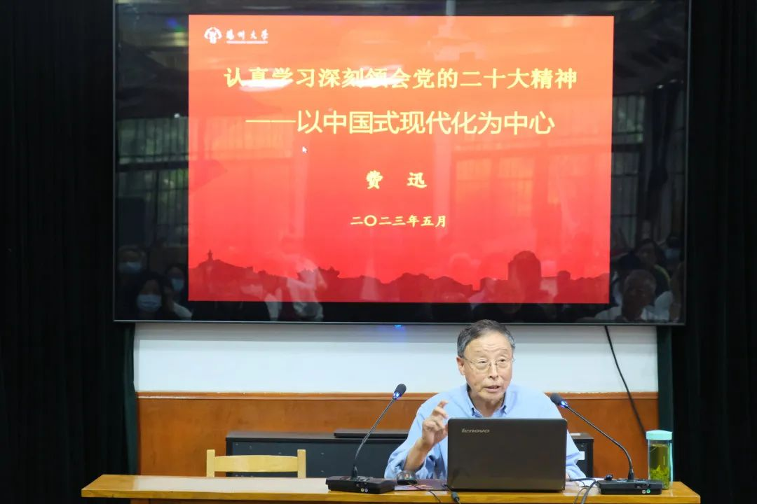 为进一步贯彻落实党的二十大精神,学深悟透党的二十大精神的丰富内涵、精神实质和实践要求,5月30日,我院邀请扬州大学理论讲师团费讯教授作“认真学习深刻领会党的二十大精神——以中国式现代化为中心”的讲座,院党委副书记高延安、瘦西湖校区离退休第四党支部全体人员和第三届丁香班学生代表参会。