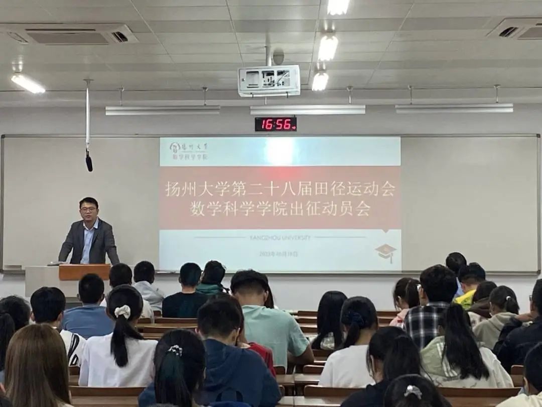 为确保校运动会顺利召开,鼓舞我院学子在运动场上绽放青春之光,10月18日下午,我院举行扬州大学第二十八届田径运动会数学科学学院出征动员会。出征仪式由院团委书记季中亚老师主持,全体运动员及工作人员参加本次仪式,院党委副书记高延安老师出席仪式并讲话。