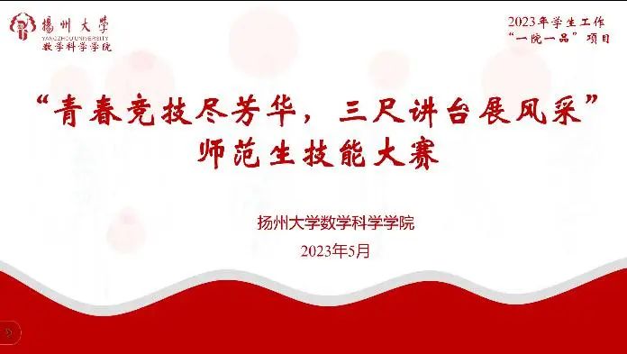 为提升师范生教师职业技能,提高我院师范生教育教学能力和专业实践能力,我院于5月21日上午在S205教室举办 2022-2023学年扬州大学数学科学学院师范生技能大赛初赛,2020级数学与应用数学(师范)专业本科生报名参与。