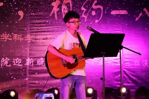 信科1601学生许少钧更是带来了吉他弹唱歌曲串烧。“纸短情长啊,诉不完当时年少”低沉富有磁性的声线交织着吉他轻快的旋律,呈现了一场听觉的盛宴。