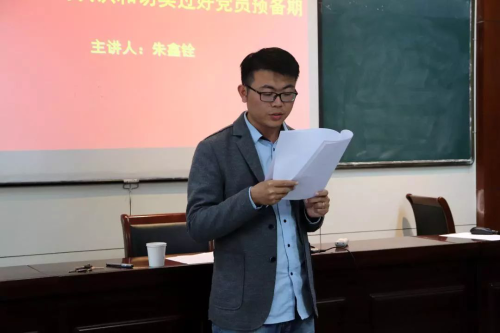 最后朱老师强调预备党员应用党员标准严格要求自己,积极参加活动帮助他人,同时更应是校纪校规执行的模范示范者,学校学院人才培养方案的组织参与和拥护者,在学习、生活、人际关系等各方面做到全面发展,品学兼优。