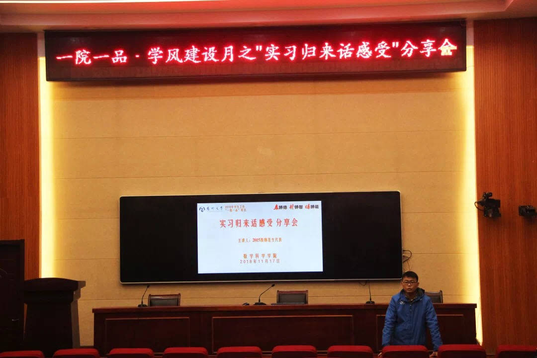 数学1502班于鹏同学今年在江苏省高邮中学实习。他认为,实践是检验知识的过程。于鹏和同学们分享了他的实习趣事,并在听课记录、批改作业等教学实践环节上和同学们交流了经验。最后,于鹏建议同学们在实习时做到“以真心换真情”,他说:“老师的一句话可能真的会改变学生的一生。”