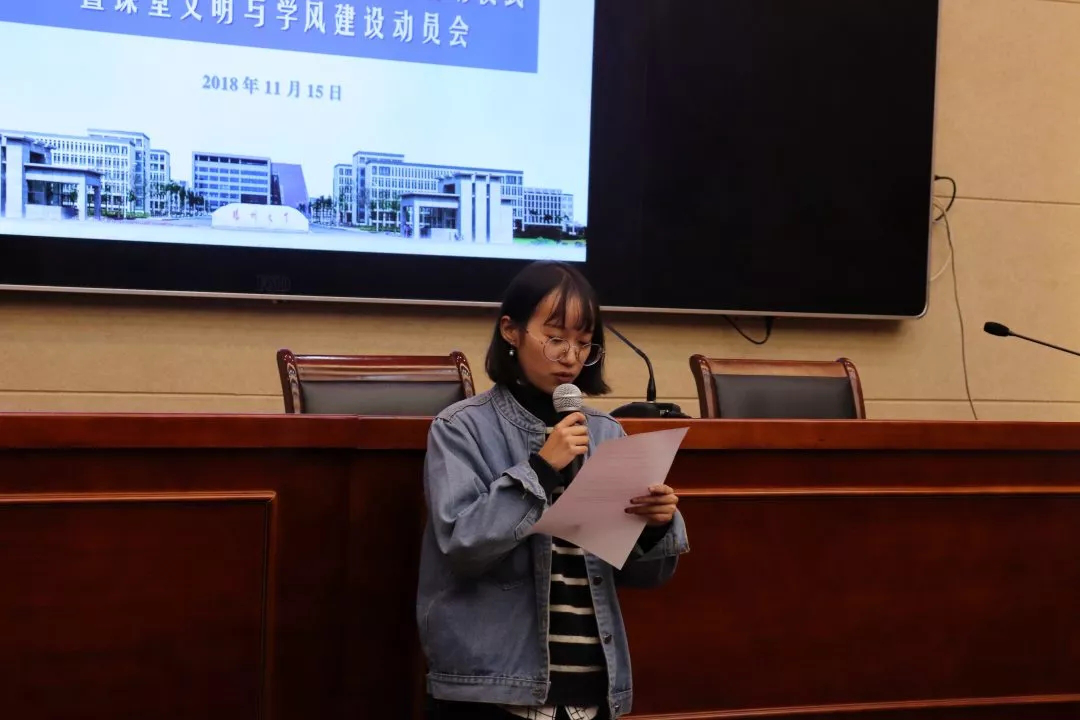 紧接着,根据近期的公约征集活动,潘丽虹、 丁一、惠筱婷作为学生代表分别发表了课堂文明公约、寝室文明公约、公共文明公约。之后,学生干部代表姜雯雯向大家宣读了基础文明建设月倡议书。