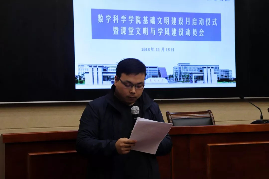 11月15日,扬州大学数学科学学院举行基础文明建设月启动仪式暨课堂文明与学风建设动员会。我院研究生本科生班长团支书、党支部书记、各学生组织主要负责人共120多人参加了此次动员会,学院团委副书记季中亚老师主持本次启动仪式。
