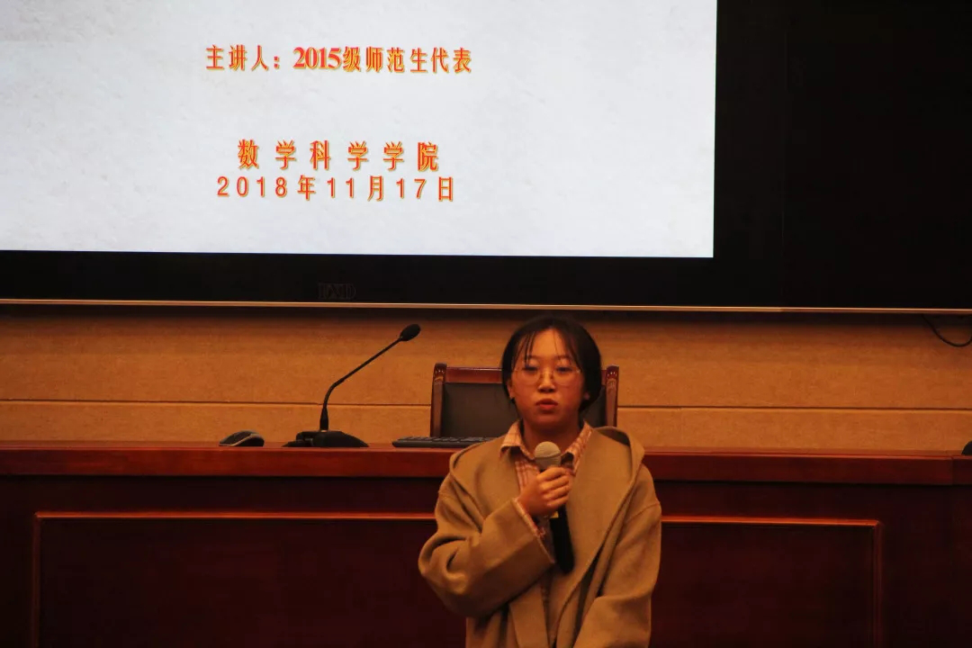 数学1502班的申明同学则与同学们分享了她在初中实习的经历。她以自己所上的三节校本课程为例,强调了实习教师的自我定位:“我不是实习老师、我就是一名真正的人民教师”,强调了树立教师威信与自信的重要。在学科教学方面,申明分享到,教师教案应当与学生学案对应好,明确讲课的目的,从而使教学效果最优化。