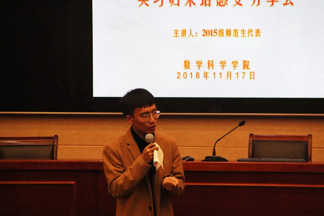 数学1502班于鹏同学今年在江苏省高邮中学实习。他认为,实践是检验知识的过程。于鹏和同学们分享了他的实习趣事,并在听课记录、批改作业等教学实践环节上和同学们交流了经验。最后,于鹏建议同学们在实习时做到“以真心换真情”,他说:“老师的一句话可能真的会改变学生的一生。”