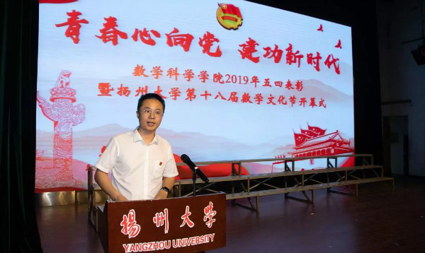 活动的第二项为举办扬州大学第十八届数学文化节开幕式,在观看十七届数学文化节视频回顾之后,院长李刚老师致第十八届数学文化节开幕式词。李刚院长肯定了我院师生始终高扬五四光荣传的积极精神,回顾了2018年我院数学文化节期间积极开展的活动以及取得的成绩。在此期间,我院学科建设、科研成果显著:计算机科学方面,为我校计算机科学学科进入全球ESI排名前1%做出了主要贡献。我院人才培养成果喜人,学生也在2018年全国大学生数学建模竞赛等各大赛事中表现突出,2018年考研率突破33%,创造了历史新高,考研质量也有所提高。