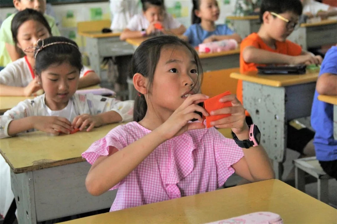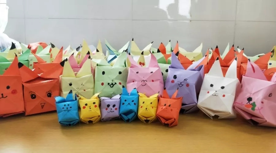 折纸是一种材料简单操作方便的小工艺,深受孩子们的喜爱。纸张的千变万化可以培养孩子们的创造性思维。但是孩子们通常会在折纸的过程中遇到问题,例如:对折不对称,不灵活等。这些问题会使孩子们失去耐心,为了解决这一问题,志愿者们先将成品向孩子们展示,激发他们的学习热情,促进学生们思维发展,并且鼓励他们进行二次创作,最后看到讲台上孩子们的作品,成员们都了解到学生发展中创造性思维的重要性。