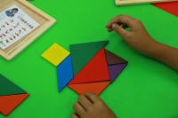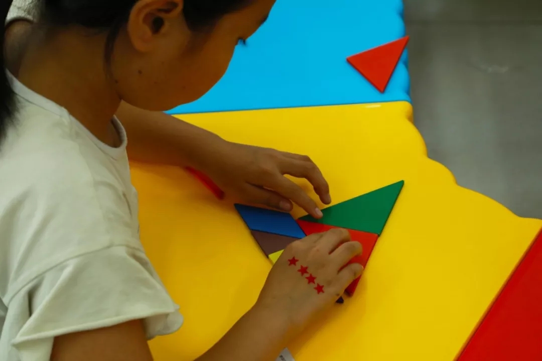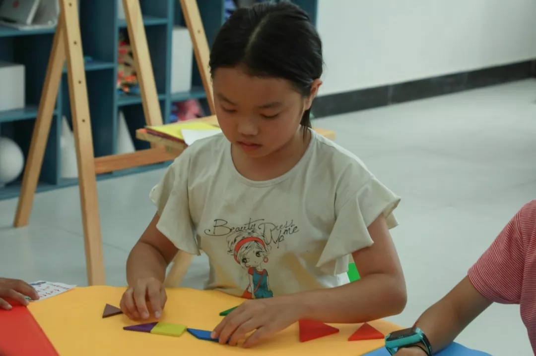 在马厂镇中心学校,趣味数学七巧板课程也在同步进行。好好老师和丁丁老师用提前画好的七巧板图纸,教小朋友们用七巧板拼出各式各样的图案。 小朋友们被分为四组,每组最先完成的小朋友会得到一颗小红星。在紧张的比拼过程中,小朋友们使出浑身解数,为小红星的争夺拼尽全力。