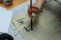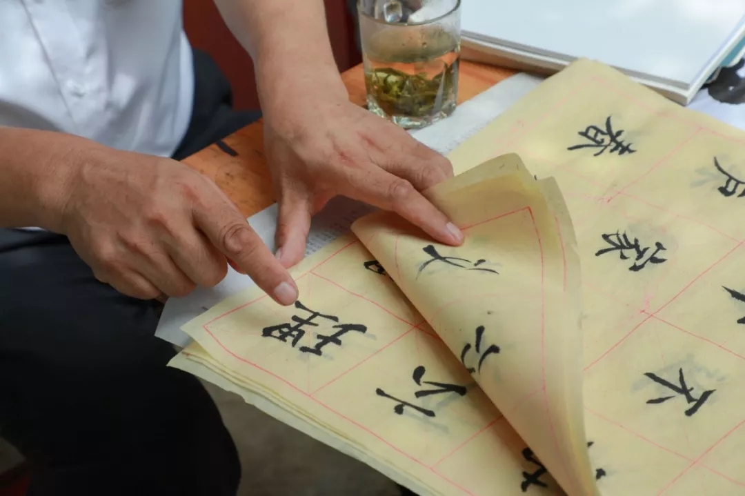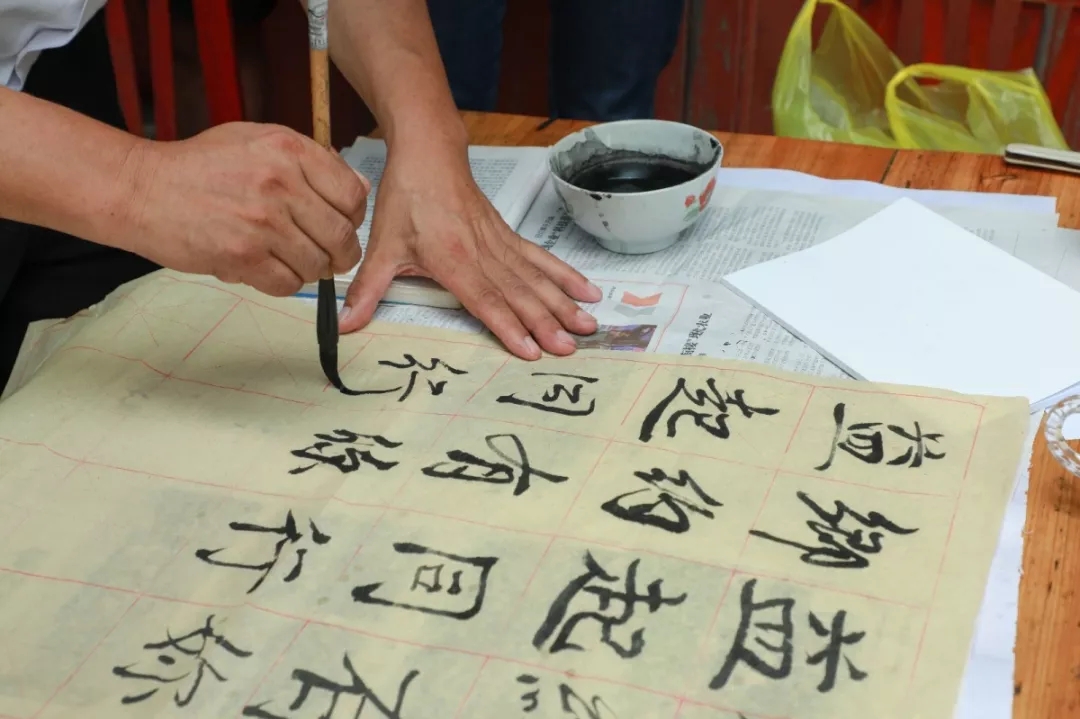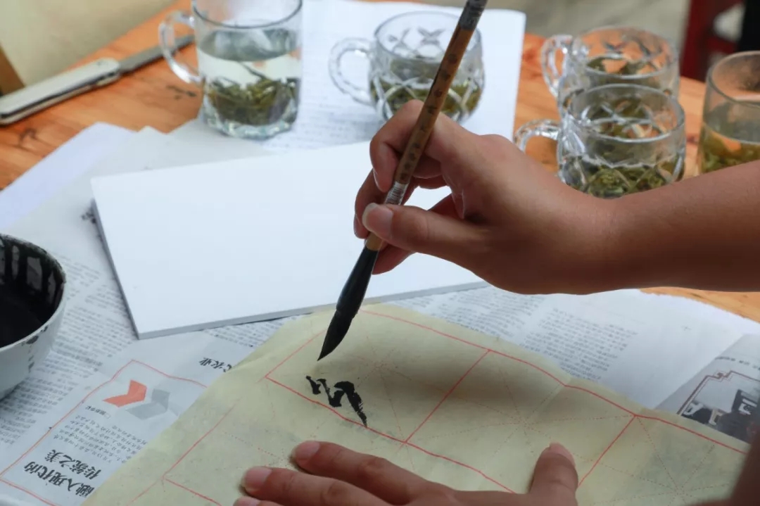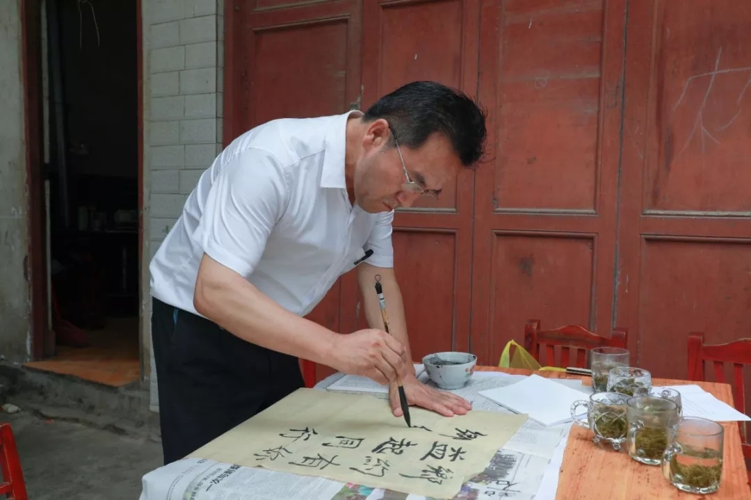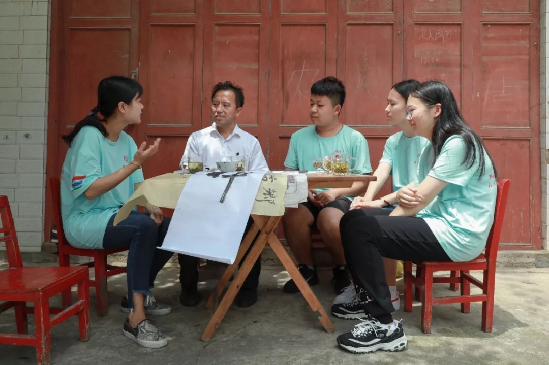 经过中午短暂的休息,团队成员冯好、丁嘉仪前往学校开始了下午的教学活动,团队剩余成员前往王文荣老师家开始了下午的调研活动。王文荣老师对于团队成员的到来表现出了极大的热情,看到团队成员的到来,他选择用书法这一独特的方式迎接。