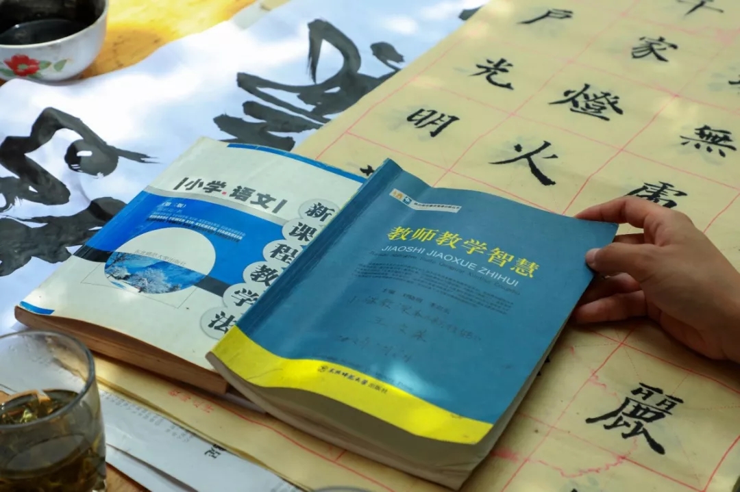 走近王老师庭院大门,是两棵古藤缠绕的参天大树,腹有诗书气自华便是对王老师最好的写照。团队一行人来到王老师摆放纸笔的石桌前,王老师便指导大家一起书写团队的口号“乡约有你,益起同行”,并将这副字赠给了创艺家团队。 王老师与团队成员坐在门口的小石桌前,开始畅谈自己乡村执教三十余年的所闻所见、所想所悟。王老师的感悟可以总结为以下三点:一是用纯洁的心灵带给学生最纯真的教育;二是在教书过程中不断丰富自己的内涵;三是无论工作岗位在何处,都要不忘初心、坚定信念。 压在笔墨纸张上面的,恰好是两本小学语文教材解读。泛黄的纸张上满满都是王老师的笔迹。王老师教导团队成员们,想要在教学过程中不断地提升自己,就要不断地研读身边能用到的一切教学资源,这也给未来的教师们启迪。 在轻松愉快的氛围中很快地度过了两个小时的时光,团队成员临别前与王老师拍下了合影。趣味数学课程