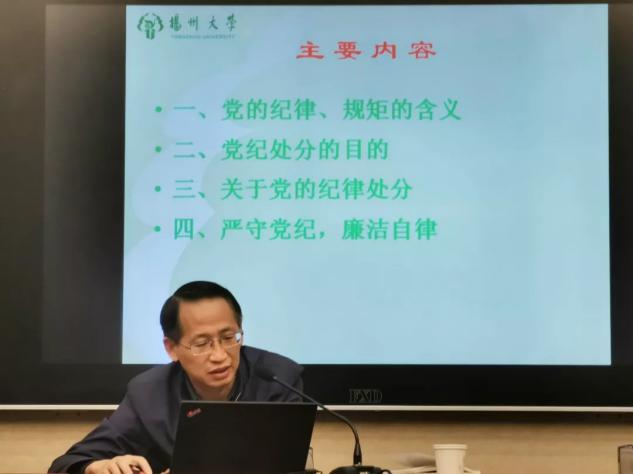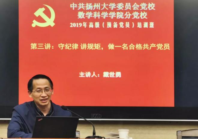 为了促进预备党员们的学习交流,并防止党支部出现“上热下冷,上紧下松”的现象,同时与预备党员们开展学习交流,10月16日晚,数学科学学院开展了2019年高级(预备党员)培训班第三讲,本次主讲人是扬州大学党委宣传部副部长戴世勇老师,数学科学学院全体预备党员参加此次讲座。