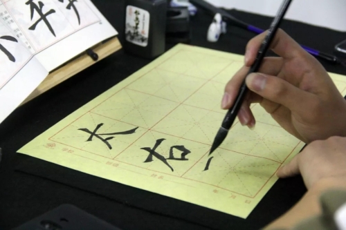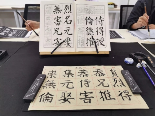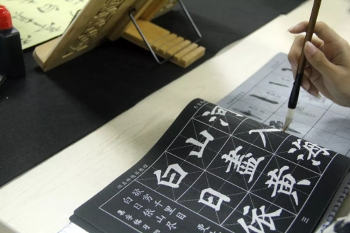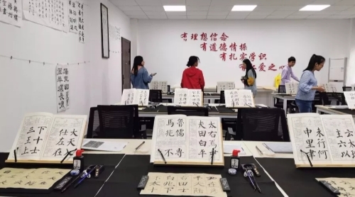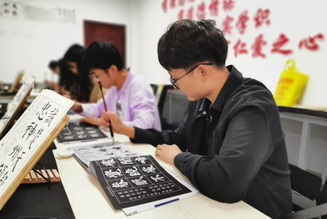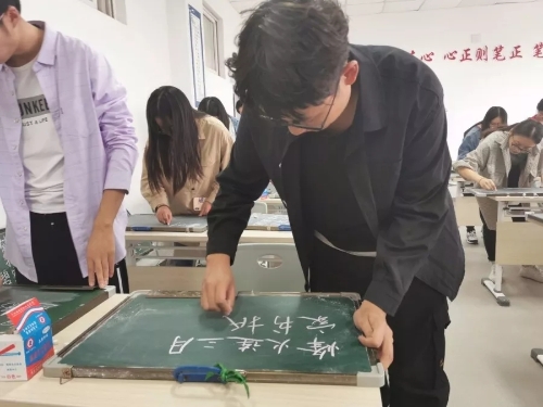 活动过程中,在专业老师,书法协会学生的带领、指导下进行相关练习操作。在练习中,学生们表现出浓厚的兴趣,积极投入活动之中,用粉笔、毛笔表达出自己的内心感受。练习中,老师对部分学生进行了专业化指导,规范了学生的握笔姿势、书写力度、字间间距等,并做了统一示范。学生在老师的指导下不断尝试改正,书写技能有了很大提高。