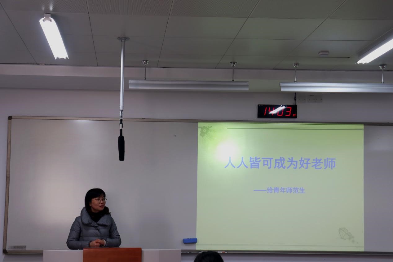 讲座开始,张老师简述了自身教书经历,阐述对“教师”这个职业的感想。“如果不爱学生,请不要走进学校。”张老师从初衷上改正同学们对教师的看法,并引用习近平总书记提出做好教师的四个标准,强调师德的重要性,提醒同学们从事教师职业时要有理想信念,要有道德情操,要有扎实学识,要有仁爱之心。