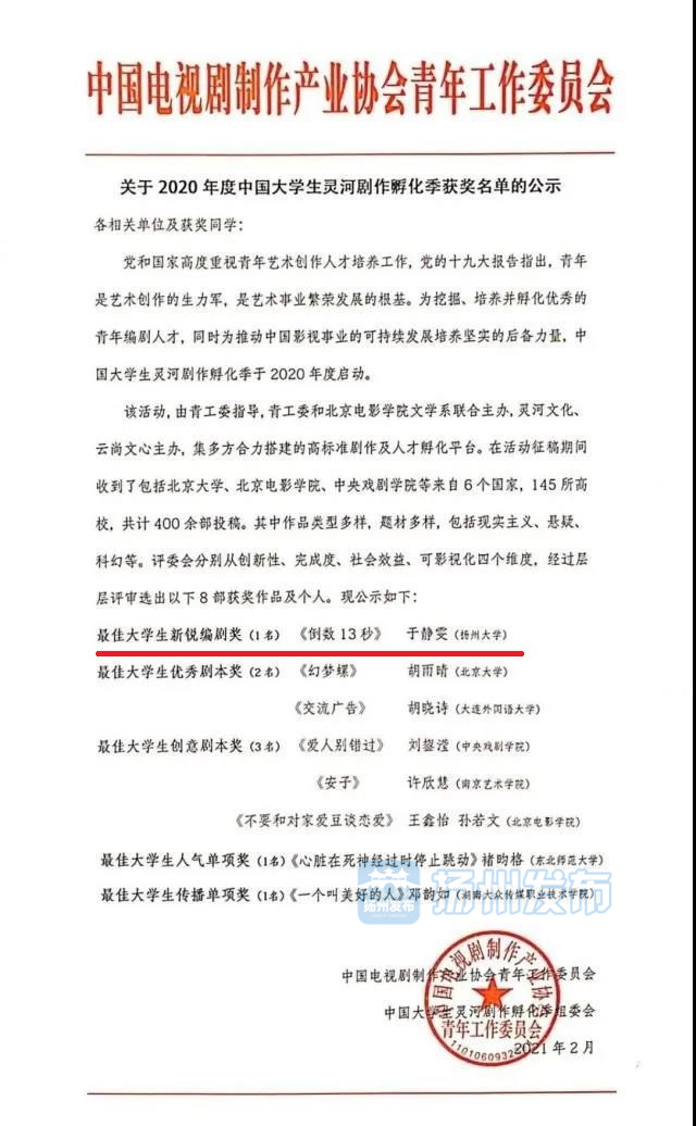 “作品名字中的13秒,灵感来源于我曾经看到过一个漫画,漫画里说人从楼顶坠落到地面的时间刚好是13秒。于是我契合自己的故事,创作了这个剧本。”近日,2020年度中国大学生灵河剧作孵化季获奖名单公布,扬州大学数学科学学院数学1901班于静雯同学凭借作品《倒数13秒》,荣获“最佳新锐编剧奖。”