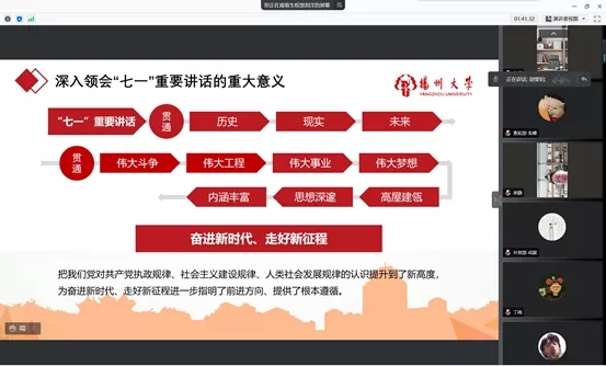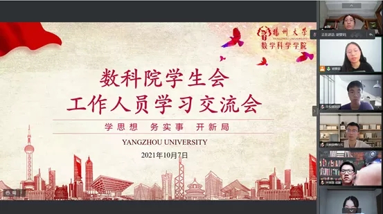 为深入学习贯彻习近平总书记“七一”重要讲话精神,进一步落实《学联学生会组织有关工作提示》中的工作要求,完善培训制度,加强管理教育,深化学生会各部门之间的交流与合作。2021年10月7日,扬州大学数学科学学院学生会全体成员线上组织进行了2021-2022学年秋学期第一次学生会工作人员集中学习交流会议。