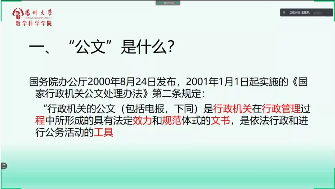 王星茗老师从自身备考事业单位以及公务员的经历出发,向大家介绍公文的含义以及特点,强调撰写公文时一定要注意时效性、真实性、规范性与程序性。接着,王老师根据行文目的,区分公文种类,强调:“作为学生干部,不要拘泥于本职工作,各组织班级间应互相学习,丰富工作经验与实干技能。”