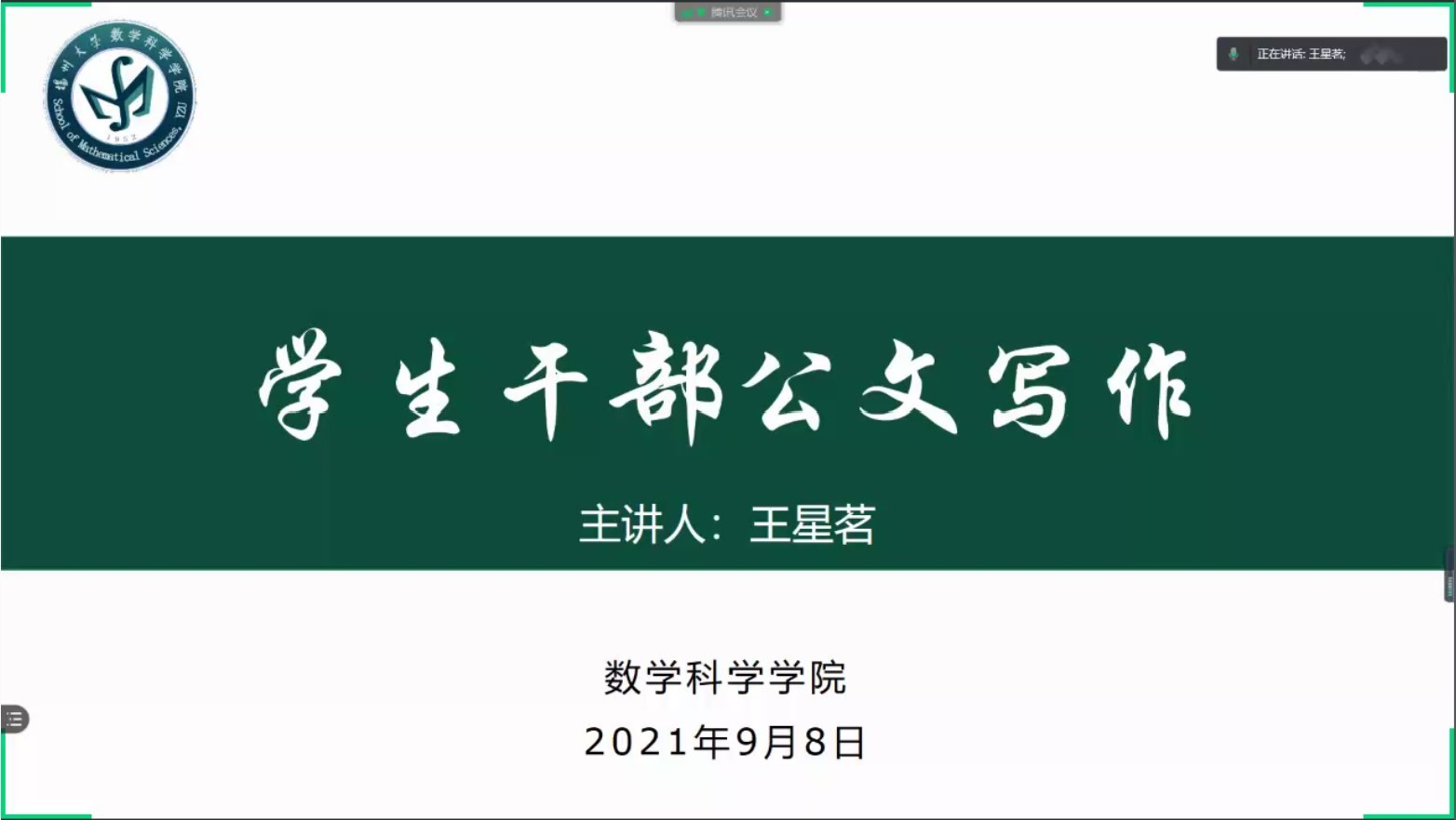 9月8日下午,我院青马工程培训班邀请到学院辅导员王星茗老师,为同学们带来“学生干部公文写作”主题讲座。2019、 2020级全体学生骨干参与此次培训。
