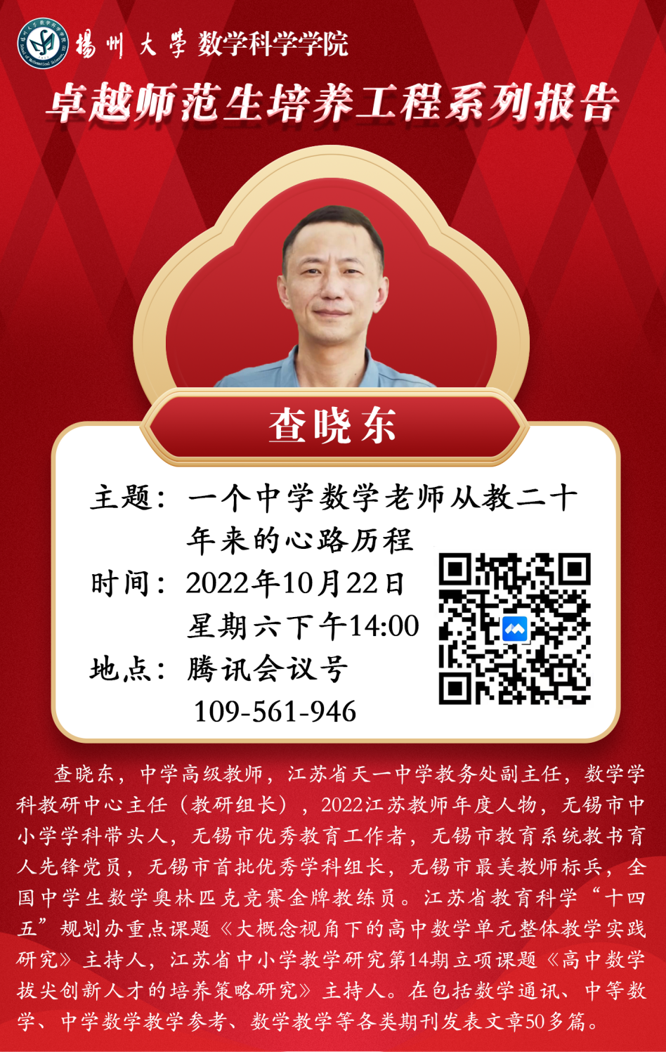 为加强我院师范生教育教学素养,坚定师范生教书育人信念,引导“准教师”努力成为“四有”好老师,我院于10月22日下午邀请江苏省天一中学教务处副主任,数学学科教研中心主任查晓东老师,为我院师范生开展“一个中学数学老师从教二十年来的心路历程”专题讲座。