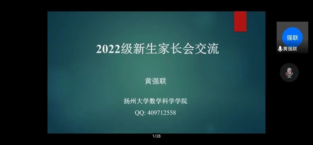 为进一步做好新生入学培养工作,加强家校间的联系,8月25日晚,我院于线上召开2022级新生线上家长会。院党委副书记朱鑫铨老师、副院长黄强联老师出席会议,会议由院团委副书记季中亚老师主持,2022级辅导员王星茗老师及22级全体新生家长参会。
