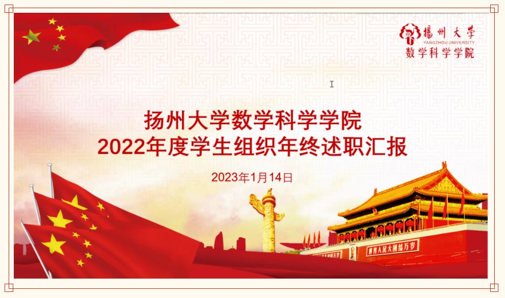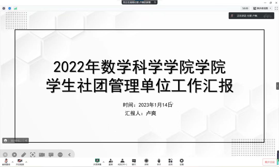为进一步加强院学生组织管理与建设,总结各组织年度工作情况,1月14日晚,我院于线上举行2022年度学生组织述职大会。院党委副书记高延安、院团委副书记季中亚老师、全体辅导员及五大学生组织成员参会。