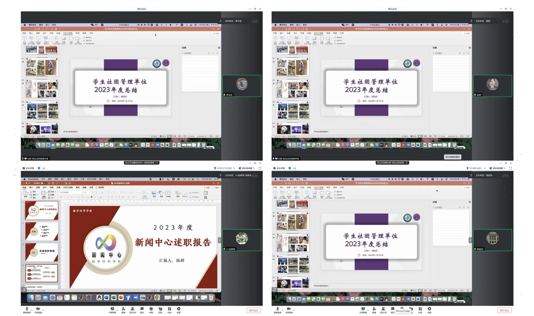 研究生会执行主席王雨、社团联合会主席钱钰洁、新闻中心主任陆妍、团委兼职副书记黄贺冉、学生会执行主席姚欣燕等人从各个方面汇报了本部门的工作和成就,同时也都指出了各部门存在的不足,对未来都进行了整体规划。在会议中,季中亚老师与各组织指导教师对各部门工作总结进行点评,并对学生组织工作开展提出改进建议。季中亚老师代表学院团委充分肯定各学生组织在2023年度取得的成绩,提出学生组织应在新一年找准不足,找准定位,切实负责地对待各项工作。最后,高延安书记指出学生组织在完善部门建设、工作精益求精的同时,要做到以负责诚恳的态度服务同学,营造良好校园氛围。