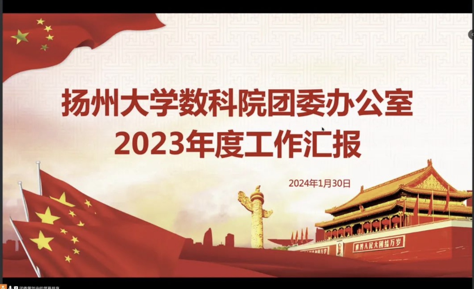为进一步加强学院各学生组织的管理与建设,全面总结年度工作情况,1月30日,我院于线上举行2023年度学生组织述职大会。本次会议由院团委书记季中亚老师主持,院党委副书记高延安老师出席会议并讲话,全体辅导员、院研究生会、社团联合会、新闻中心、团委办公室和学生会全体学生干部参会。