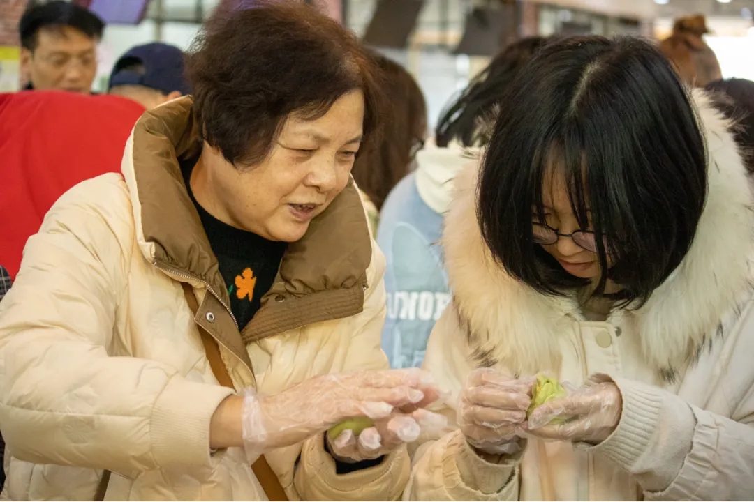 活动现场热火朝天,老师与同学们互帮互助,携手共包青团。小小青团见证着学子与老师之间的欢笑,勾连起学生与老师之间浓浓的师生情。青团之清,在于其色。碧绿的外皮,如同青翠的润玉,将生机勃勃的绿意融入每一颗团子之中。青团之香,在于其味。甜而不腻,糯而不粘。青团的内陷口味丰富:有豆沙、莲蓉等传统口味;也有芋泥、蛋黄肉松等新鲜口味,更加符合现代人的口味需求。