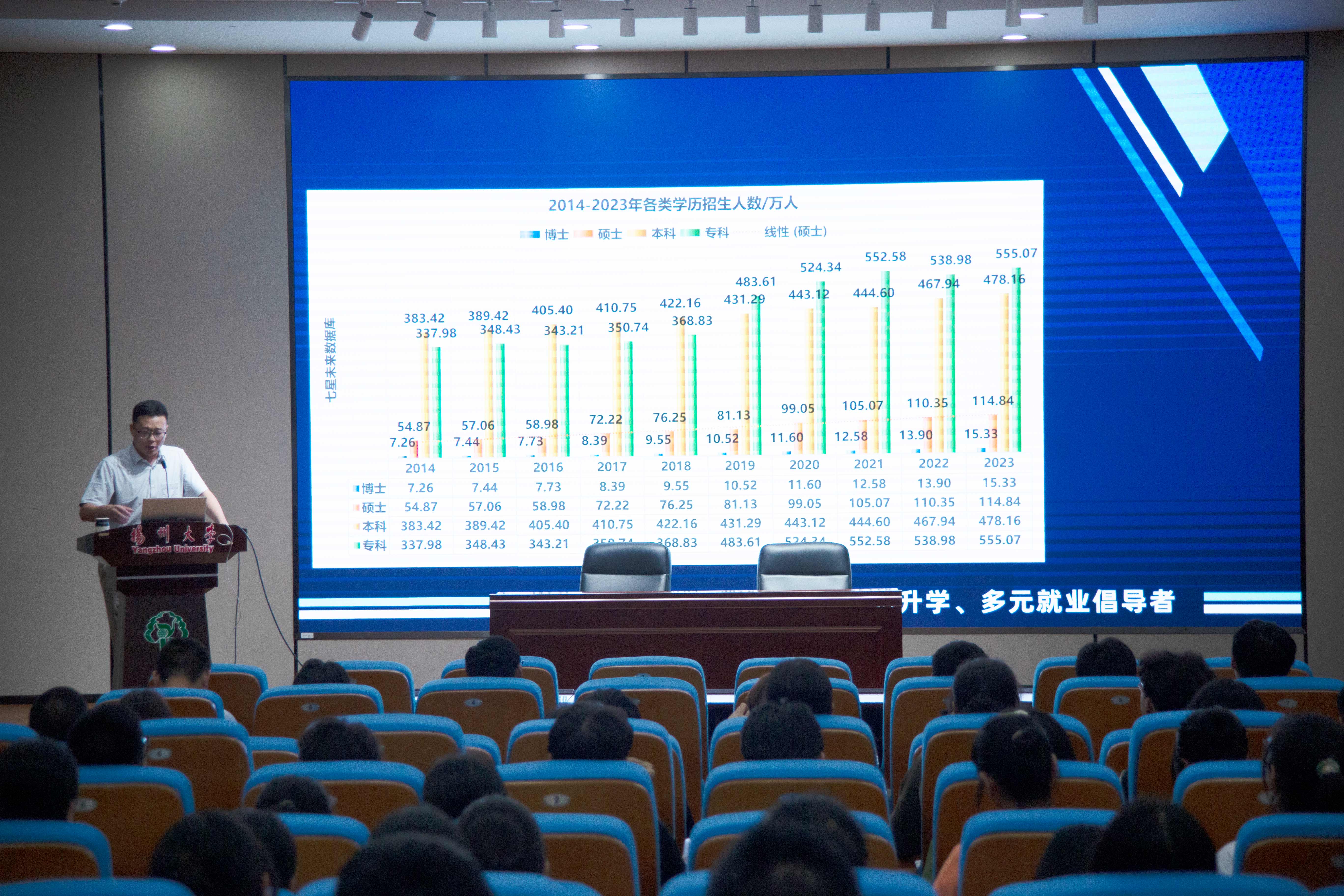 会议包含五大章内容:一,就业形势分析;二,升学规划;三,读研择校择专;四,考研全流程;五,保持热爱,不负韶华。韩老师就什么是大学引出“大学是生机盎然的迷宫”,向同学们介绍大学生活并进行提问。通过展示分析历年各类学历的招生人数、企业看重毕业生因素、公务员考试现状及央国企就业概况,鼓励新生“打铁还需自身硬”,努力提升自身素养,踏实奋斗。对大学生升学规划方向及优劣势分析,韩老师向新生详述考研的最新形式及分析,剖析读研的意义。同时深入专业具体概念,详细讲解考研流程,提出专业选择分为个人兴趣,个人能力以及社会需求三个因素,希望大学生提高眼界,勇担家国责任,保持热爱,不负韶华,奔赴人生的山海。