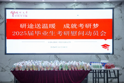 为进一步做好我院2025届毕业生引领工作,坚定他们的考研决心和信心。我院于11月18日在数学科学学院一楼举办2025届考研慰问动员会。本次会议,院党委书记郭丽老师,院长凌智老师,院党委副书记高延安老师,团委书记季中亚老师,辅导员王星茗老师,辅导员顾妍老师,辅导员王静老师,辅导员张超老师以及全体2025届考研学生参会。
