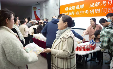 为每一位考研学子精心准备的“考研大礼包”中,有联想“高升”的脆升升薯条、寓意“乐事”的薯片、谐音“心想事‘橙’”的橙子、祝愿“梦想成真”的喜之郎果冻、50元的研途助考券,还有老师和同学们亲手写下祝福的“前程似锦”贺卡,美好的寓意背后满满都是支持和关爱。