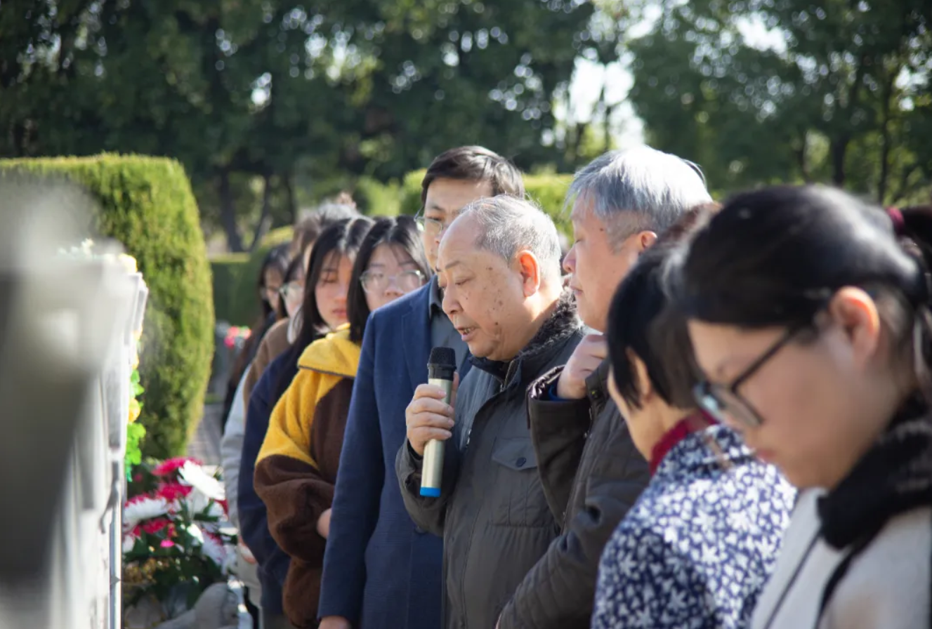 本次仪式由季中亚老师主持。他首先向在场的各位同学详尽地介绍了丁湘老师的一生事迹,紧接着全场肃立,共同为逝去的丁湘老师默哀一分钟,以无声的方式寄托我们的哀思。在庄严肃穆的氛围中,关工委詹玉铸老师对着丁湘老师的墓碑,深情地向这位已故教育家汇报了近期党支部及“丁香班”的丰硕成果。“丁香”班的学生代表孙凡蕊同学紧接着发表了讲话。她首先详细介绍了班级的学习状况,然后强调了将“丁香”精神持续弘扬并传承的重要性。在会议尾声,季中亚老师发表了总结性讲话,他激励所有学生提高集体荣誉感,并倡导传承与弘扬“丁香”精神,以期再度铸就“丁香”班级的荣耀。