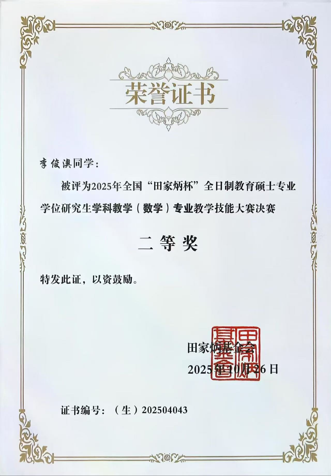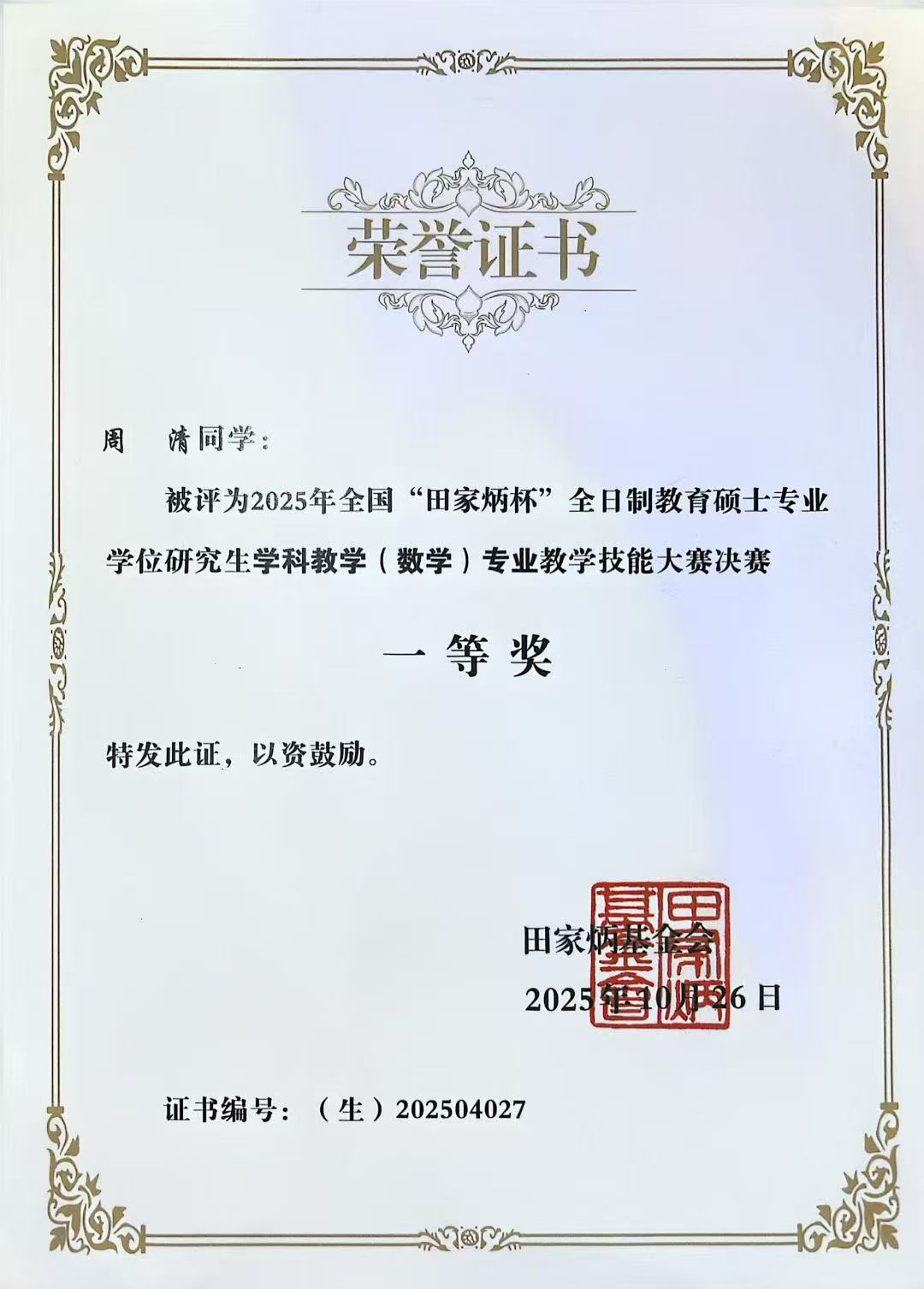全国“田家炳杯”全日制教育硕士专业学位研究生学科教学(数学)专业教学技能大赛是由全国教育专业学位研究生教育指导委员会指导、田家炳基金会冠名支持的高级别专业赛事,面向全国教育硕士研究生,是国内师范生教学技能培养与展示的重要平台之一。大赛以其高规格、强专业、严选拔著称,赛事覆盖全国众多师范院校及综合性大学教育学院,竞争激烈,获奖难度大,在师范教育领域具有广泛影响力与认可度。此次参赛旨在以高水平竞赛为平台,检验与提升师范生的教学实践能力,推动我院卓越教师培养模式的深入发展。
