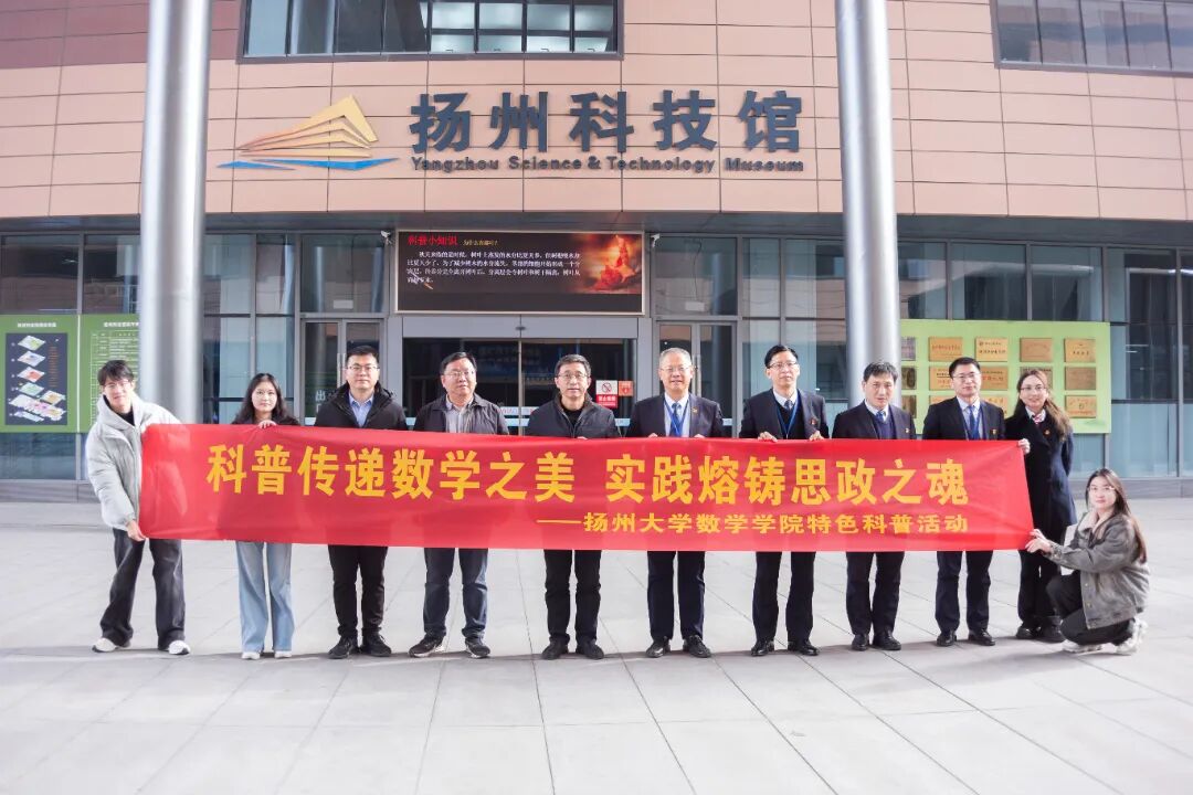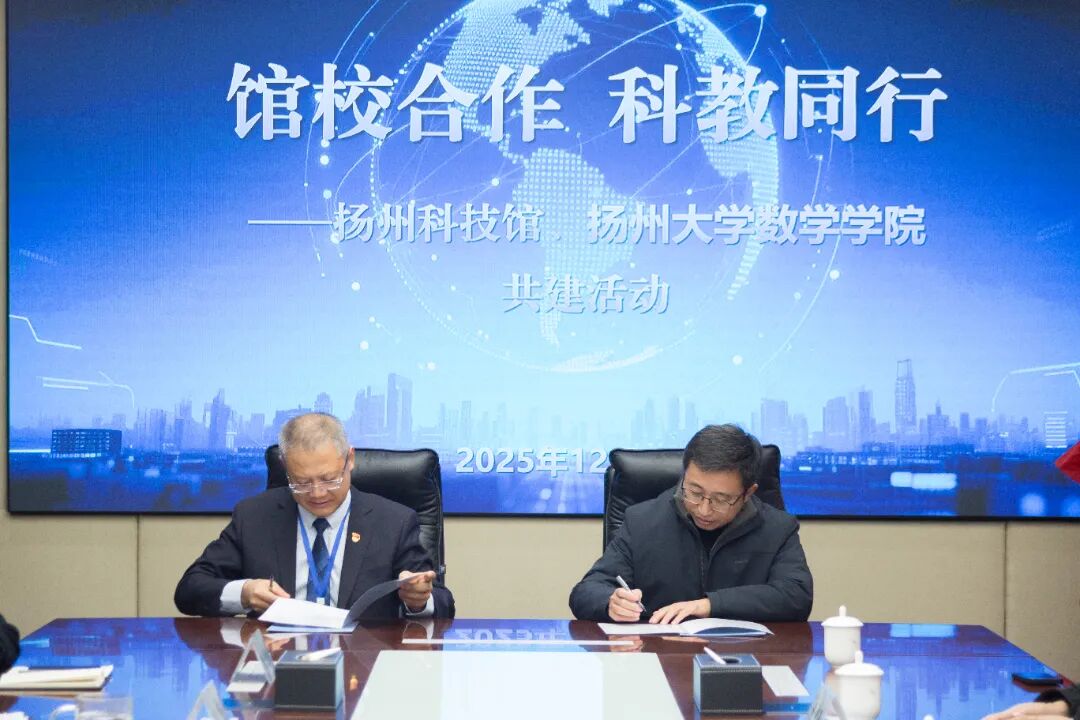 2025年12月12日上午10:00,扬州科技馆与扬州大学数学学院正式达成馆校合作,仪式在扬州科技馆四楼隆重举行,我院党委副书记周锋、副院长黄健飞、团委书记季中亚老师、辅导员周未老师,与扬州科技馆馆长王宇明、副馆长朱晔、刁国斌以及展教部部长魏元琳、刘连华共同出席本次仪式,本次活动由扬州科技馆副馆长刁国斌主持。