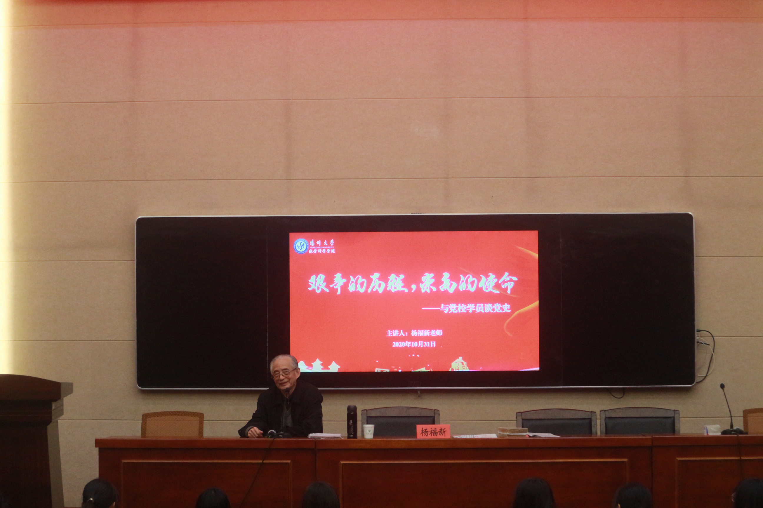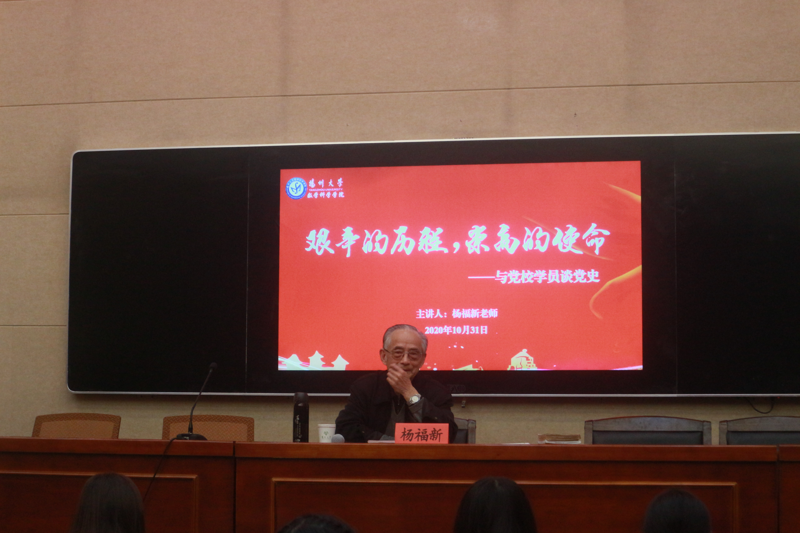 10月31日下午,为帮助高级党校学员与递交入党申请书的2020级学生更好地了解党史和中国共产党,数学科学学院邀请杨福新老师于瘦西湖校区28号楼进行党史宣讲。