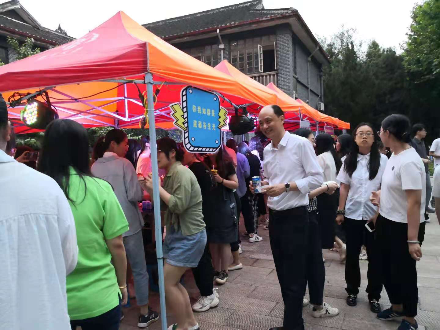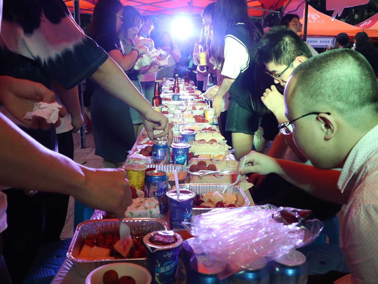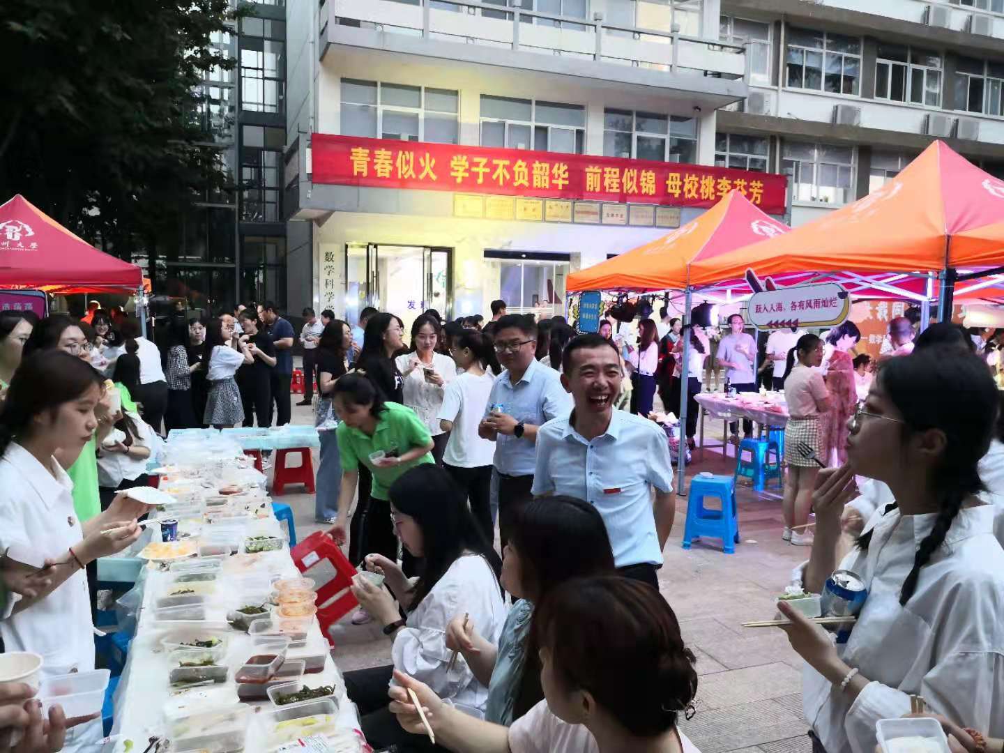 从中午开始,瘦西湖校区数学科学学院办公楼前的空地上,开始搭起了一顶顶帐篷。下午五点多,老师们为毕业生精心选购的糕点、水果等冷餐陆续送到,学弟学妹们齐动手,开始分切水果。六点多开始,随着毕业生和老师们陆续到来,现场立马热闹起来。同学们经过多年的努力学习,今天终于完成了学业,拿到了毕业证书,奔向更美好的未来。大家在品尝美食的同时,师生们回顾一起度过的时时刻刻,畅谈学习生活中的点点滴滴,不时一起合影留念。青春似火,学子不负韶华;前程似锦,母校桃李芬芳!在即将离校之际,学院为他们准备的别具一格的师生话别冷餐会,令毕业生们倍感惊喜,对学院的精心安排表示感谢!毕业生们将带着的美好回忆、对母校的感恩之情和全院教师的真切祝福与热切期盼,奔向前程!
