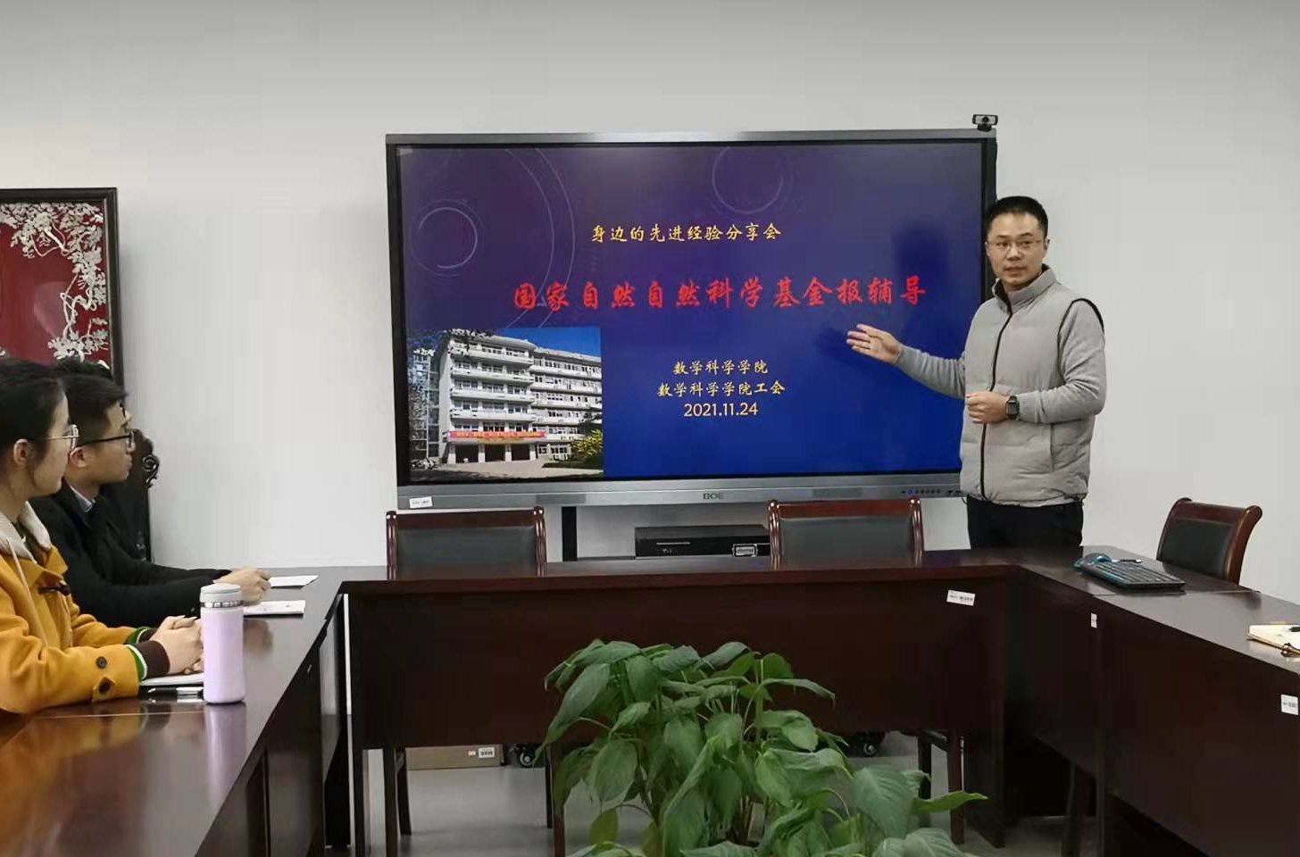 2021年11月24日,数学科学学院和院工会举办身边的先进人物经验分享会,邀请我院二级教授,共产党员林支桂老师为年轻教师分享多年来的科研工作体会,和国家自然科学基金申报的经验。这是我院的劳模进校园系列活动之一。活动在瘦西湖校区数学学院208会议室举行,副院长张来教授主持了分享会。