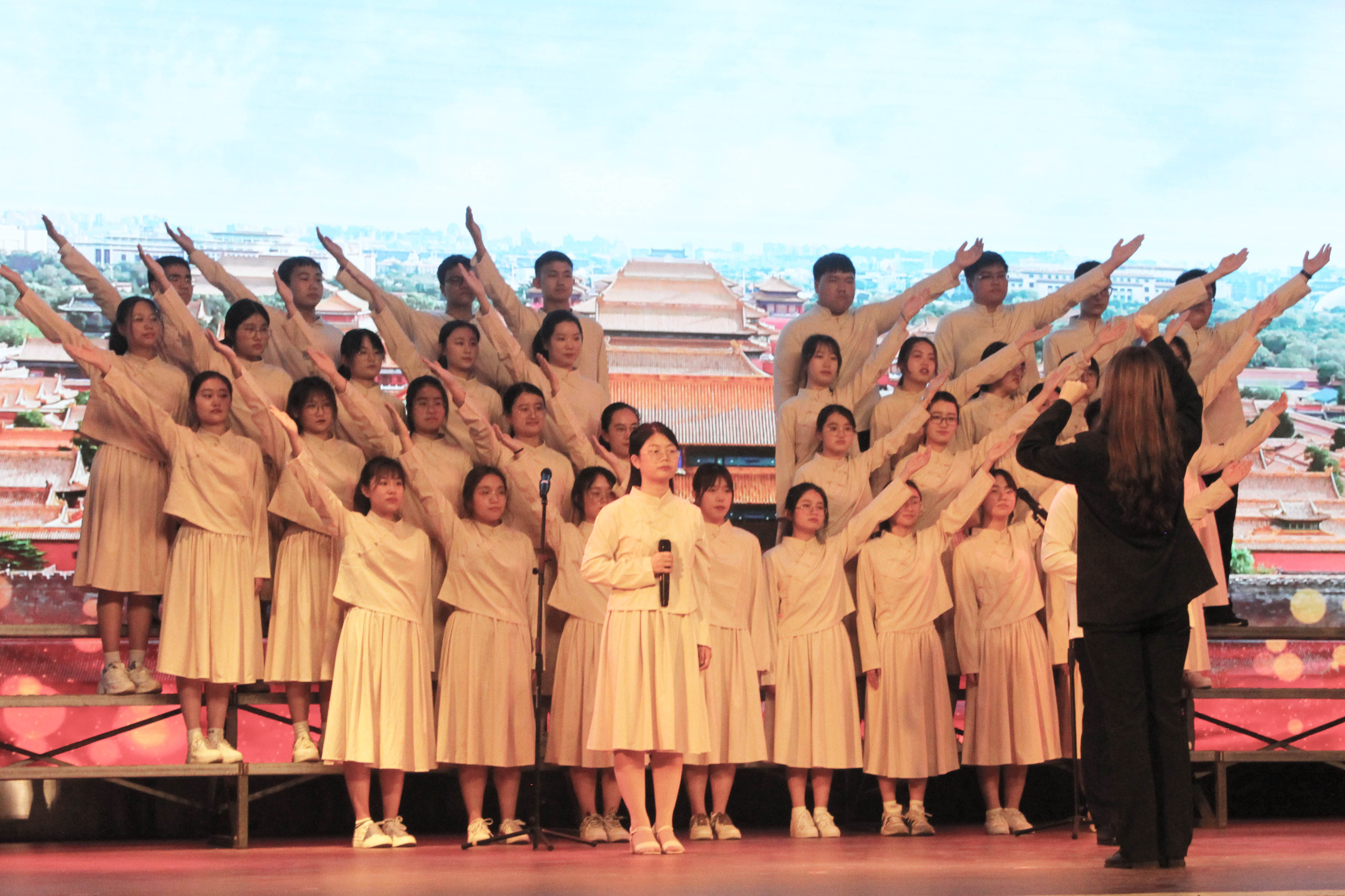 扬州大学校歌响起,全体师生起立奏唱,在歌声中第一项议程正式结束。欣赏完校艺术团带来的舞蹈《八女投江》后,进入本次活动第二项议程——五四合唱汇演。