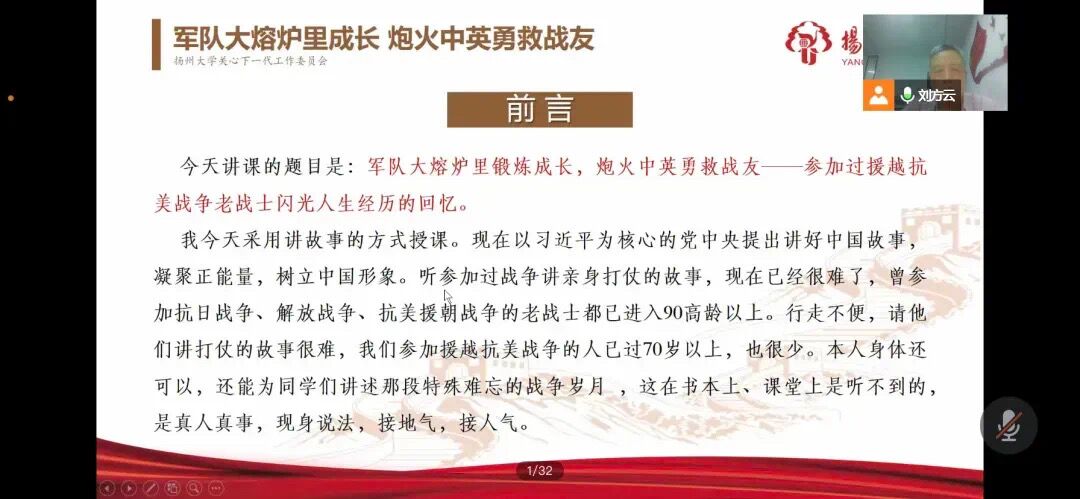 刘方云主任采用讲故事的方式,叙说自己成长历程,提醒同学们做人要不忘本、不怕穷苦,要懂得知恩图报。他还呼吁同学们应立志为人民服务,学习并背诵毛主席著作,让毛泽东思想成为指引前进方向的灯塔。作为援越抗美战争的老兵,刘主任用质朴的语言畅谈自己军旅生涯的真实感怀,多个战斗英雄故事,两段视频,讲述他冒死救战友,退伍后从事关心下一代工作,“戎装信”佳话等多个事迹。