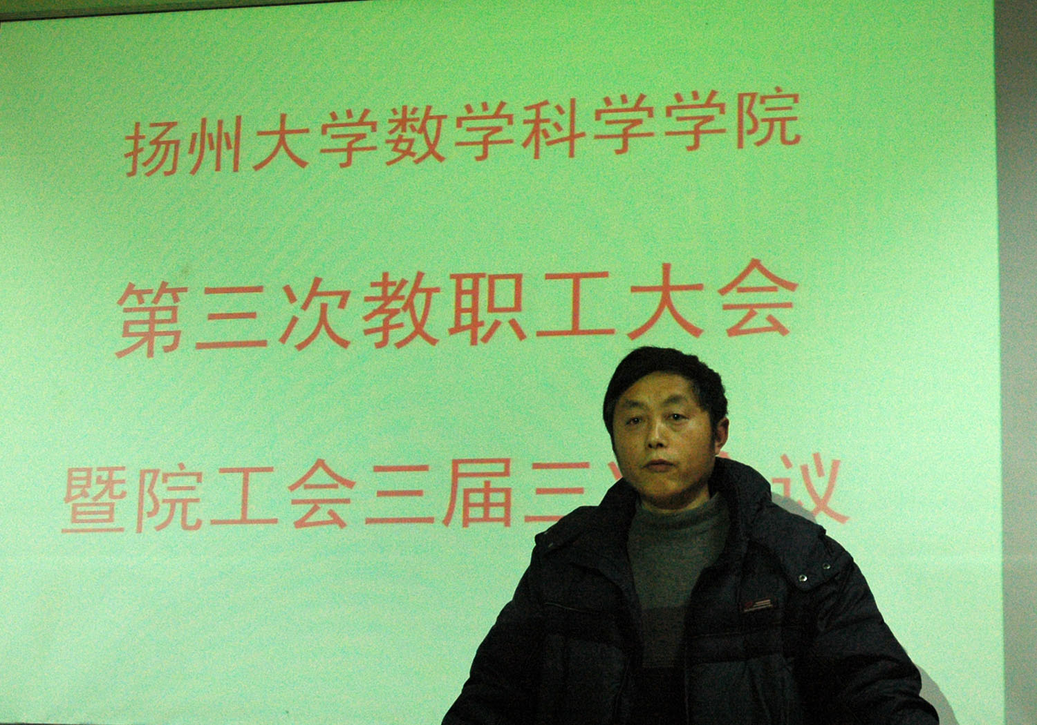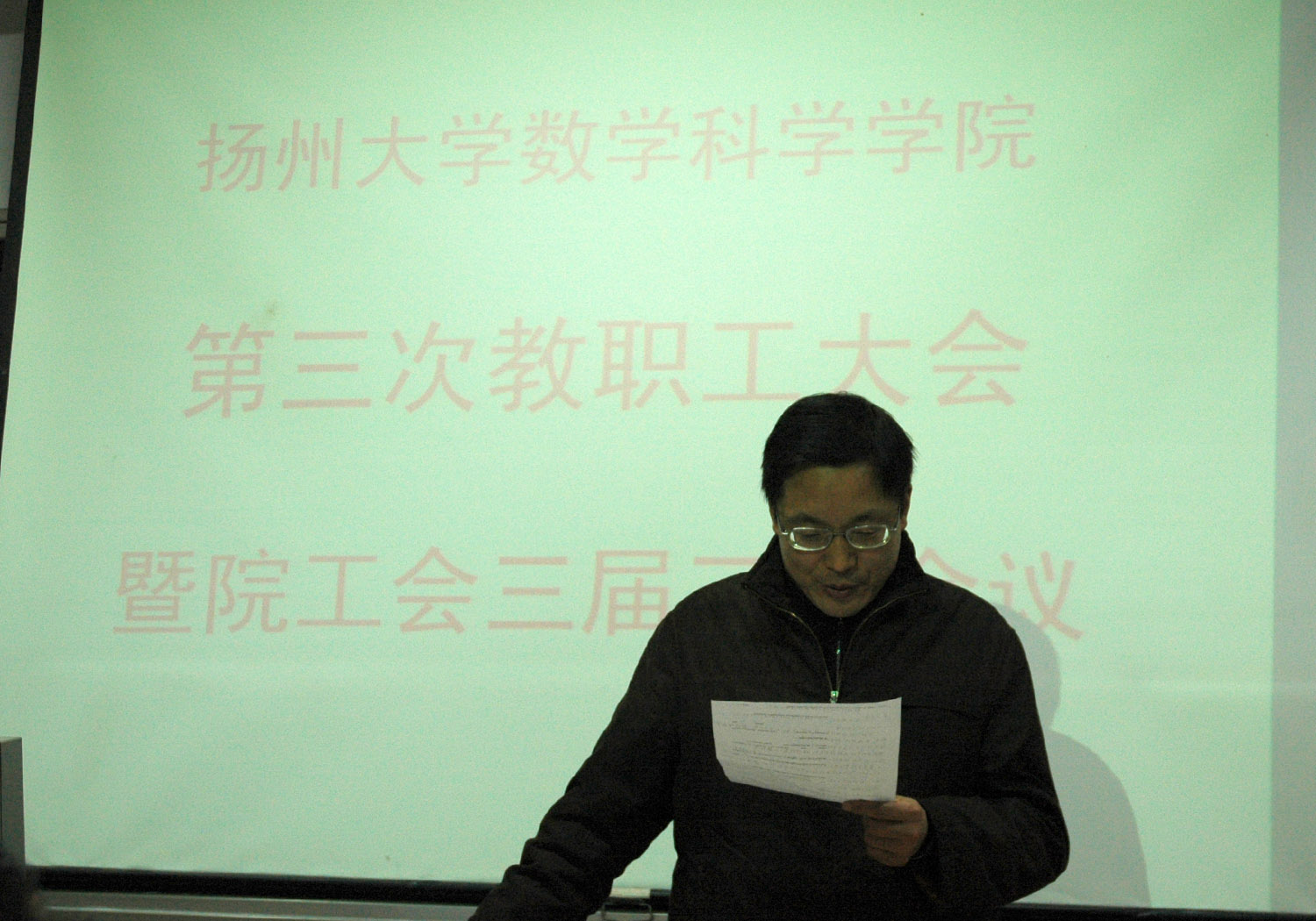 为加强学院民主管理,2010年1月20日下午在瘦西湖校区038幢数学科学学院召开了第三次教职工大会暨院工会三届三次会议,王宏玉院长向全体教职工报告了2009年工作,刘长龙副院长报告了2009年学院经费预决算情况,工会主席季新华向全体会员报告了2009年工会工作,推进学院民主管理和院务公开。