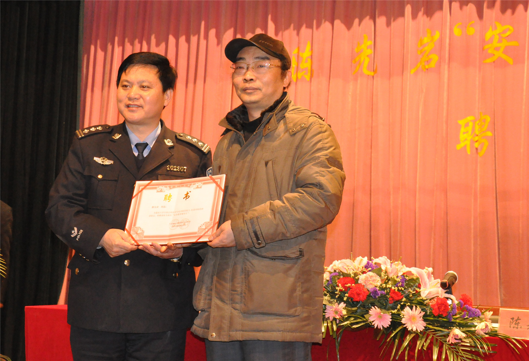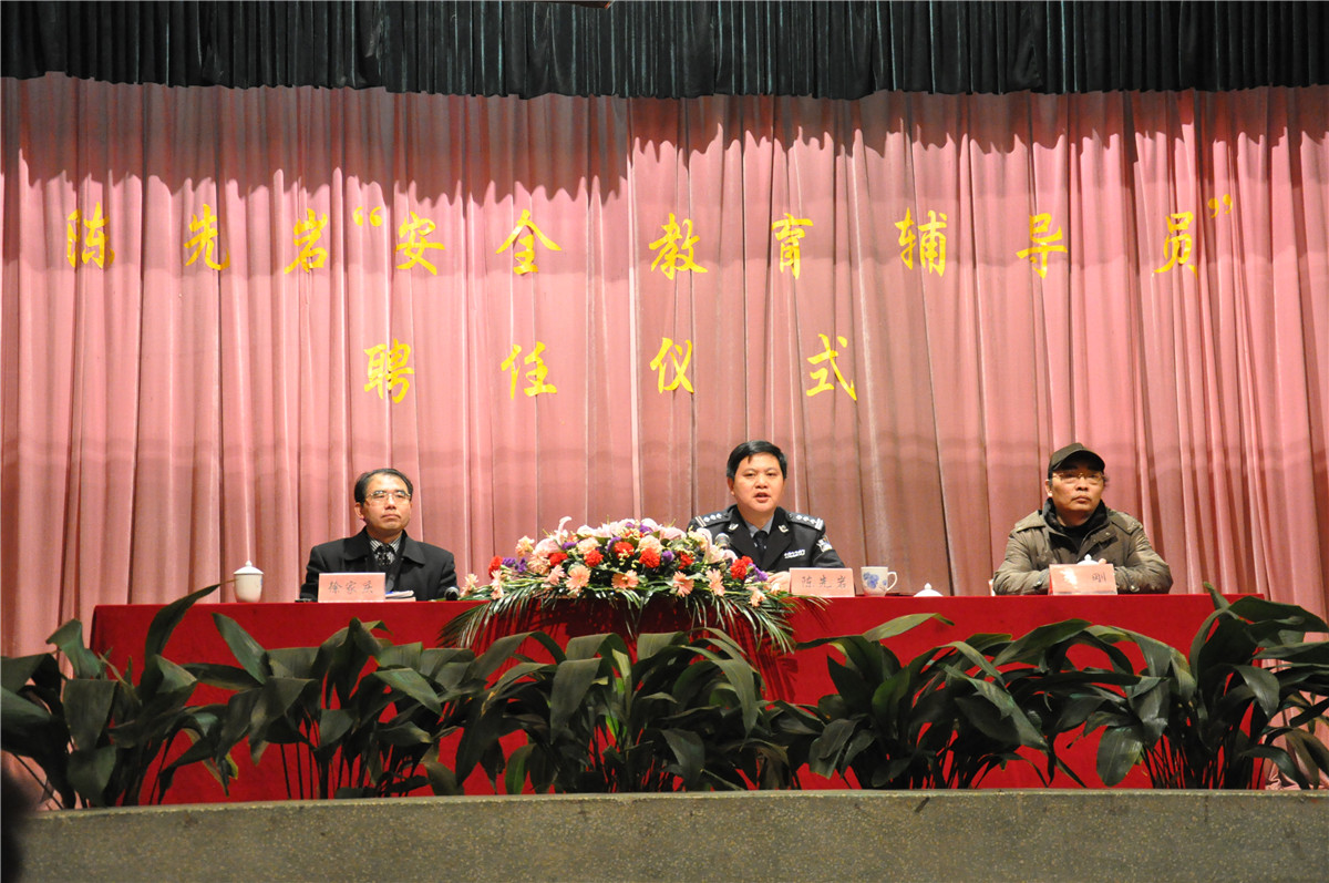陈先岩同志长期从事社区警务工作,有着“治安防范能手”的美誉。为了提高大学生的法制意识与安全防范能力,促进高校的和谐与稳定,数科院特聘请他为大学生“安全教育辅导员”。在授聘仪式上,院长李刚教授向陈先岩同志颁发了聘任证书。