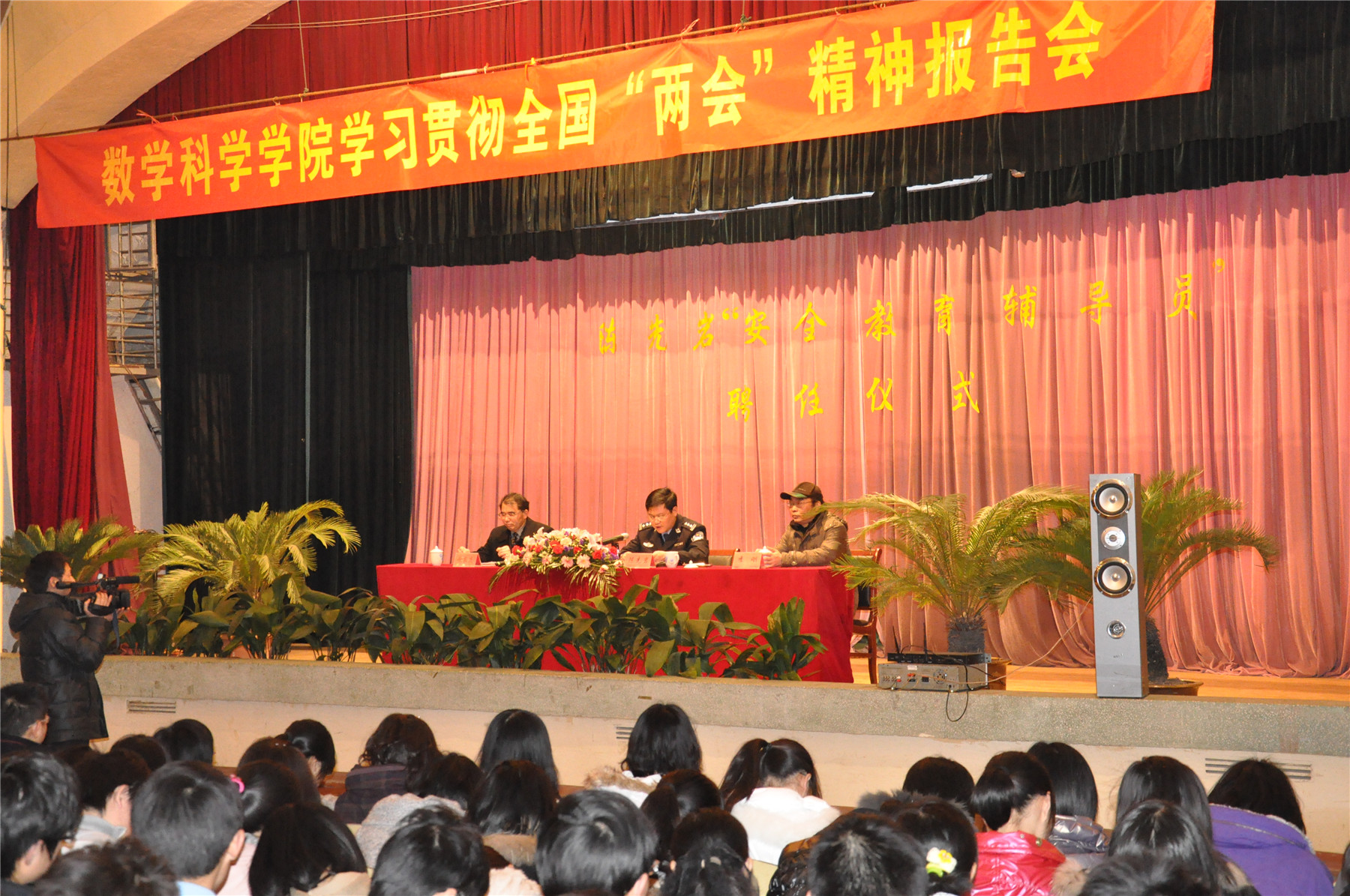 3月23日下午,数学科学学院在瘦西湖校区人防大礼堂举行学习贯彻全国两会精神报告会暨陈先岩“安全教育辅导员”聘任仪式。全国公安系统一级英模、全国人大代表陈先岩同志受聘为数科院大学生“安全教育辅导员”,并应邀作了全国两会精神传达报告。学院师生共700人出席报告会。