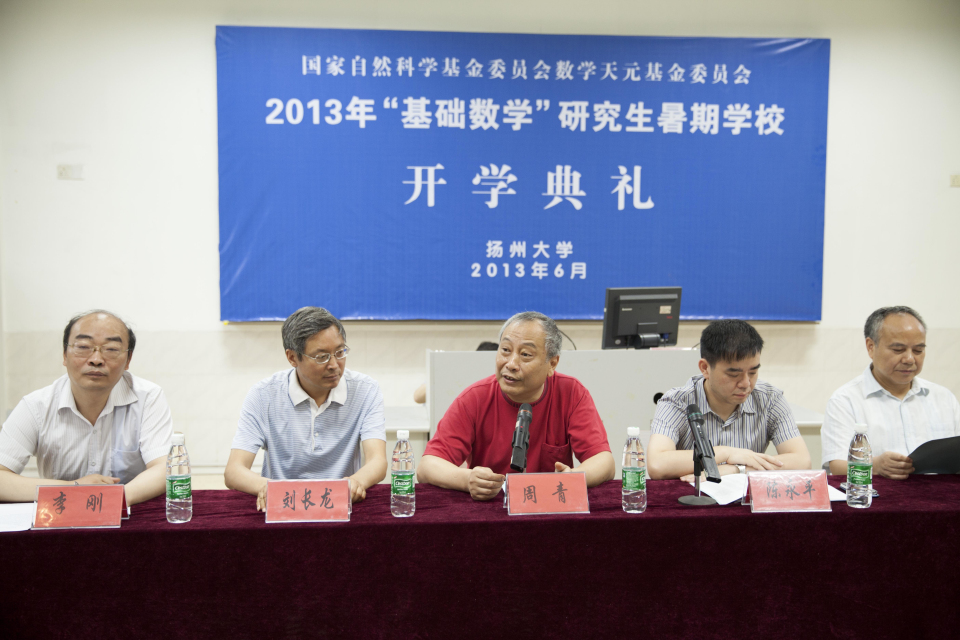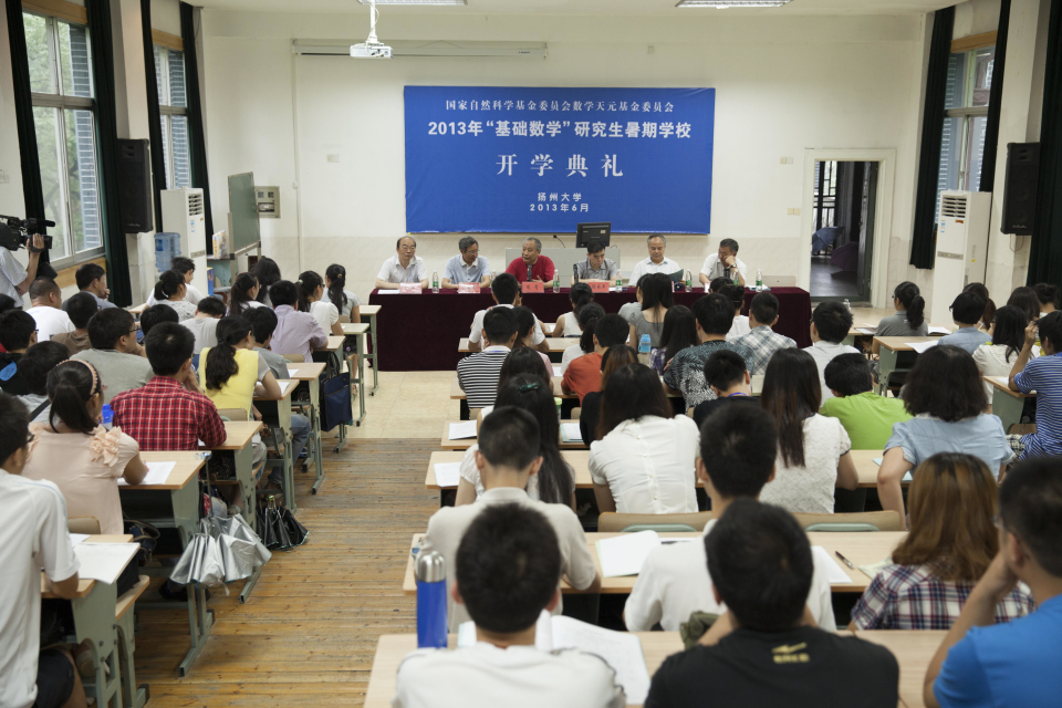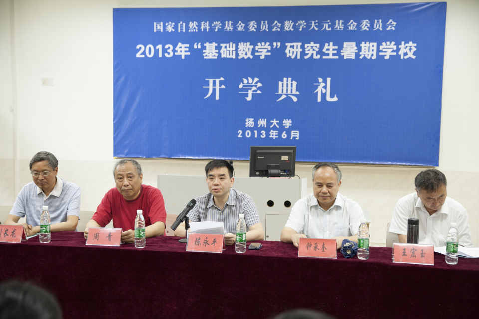 2013年6月27日,由教育部、国家自然科学基金委数学天元基金委资助的第二届全国“基础数学”研究生暑期学校在我院开班。这也是继2012年以来,我院第二次被选为“基础数学”研究生暑期学校的承办单位。北京大学、南京大学、上海交通大学、山东大学等全国66多所高校的100余名博士、硕士研究生会聚扬州,参加研究生基础课程的学习和学术讨论、学术交流活动。国家杰出青年基金获得者、原国家自然科学基金委数理学部副主任、华东师范大学周青教授,扬州大学副校长陈永平教授等出席开学典礼并分别致辞。院党委书记刘长龙,授课教师代表、南京大学钟承奎教授、扬州大学王宏玉教授出席开学典礼,李刚院长主持典礼仪式。