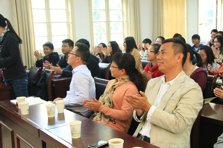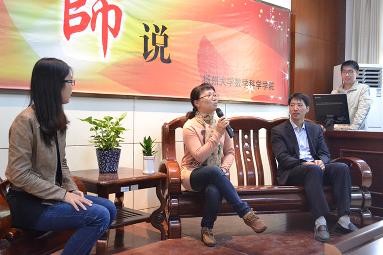 “作为一名师范生,今日我们是教室里求贤若渴的学子,明日我们终将接过粉笔成为一名真正的教师,而前辈的指引在这条路上有着不可忽略的意义。”10月22日,扬州大学数学科学学院举办了第一期主题访谈会——《师说》,本次访谈的嘉宾是两位扬大校友、高中一线优秀数学教师,王祥福和张蓉芳。 作为有着丰富教学经验的教师,同学们首先认识了来自扬州中学的王祥富老师。王老师曾多次指导学生获得国家级、省级竞赛荣誉;今年在他的高考班中出了四位清华北大的学生。当被问及他是如何取得这些成就的,王老师精炼地概括为“实力”、“胸怀”、“眼光”六字。他告诉在场的师范生们,首先,如果个人缺乏教学实力那将无法使学生信服自己,教学之路亦会坎坷难进;其次,要用博大的胸怀来包容学生,让“爱”作为正能量在师生间良性传播,才能让教育之路越走越远;最后,他提出要成为一名优秀的教师还要有精准的眼光,会以敏锐的洞察力认识学生,发现并挖掘学生潜能。当主持人提到,在应试教育下学生的学习兴趣不高时,王老师指出,那就要想方设法地把课堂内容变得有趣生动。他以函数教学之例,他认为化虚为实、数形结合,才能让学生充分理解教学内容,全面把握知识要点。同时,他主张课堂的自化主,在老师的指导下,给学生自由的空间,任其思考发挥是最好的引导式教学方法。数学科学学院大四学生钱孟娇是王老师的实习生,本次访谈会上,她讲到最令她钦佩是王老师的教学热情——从工作之初到现在,王老师一直在教育前线兢兢业业、勤勤恳恳地为学生们解决一切学习中的困难,摸索最优的教育方法,他的教学精神值得在场的每一位师范生深入学习。