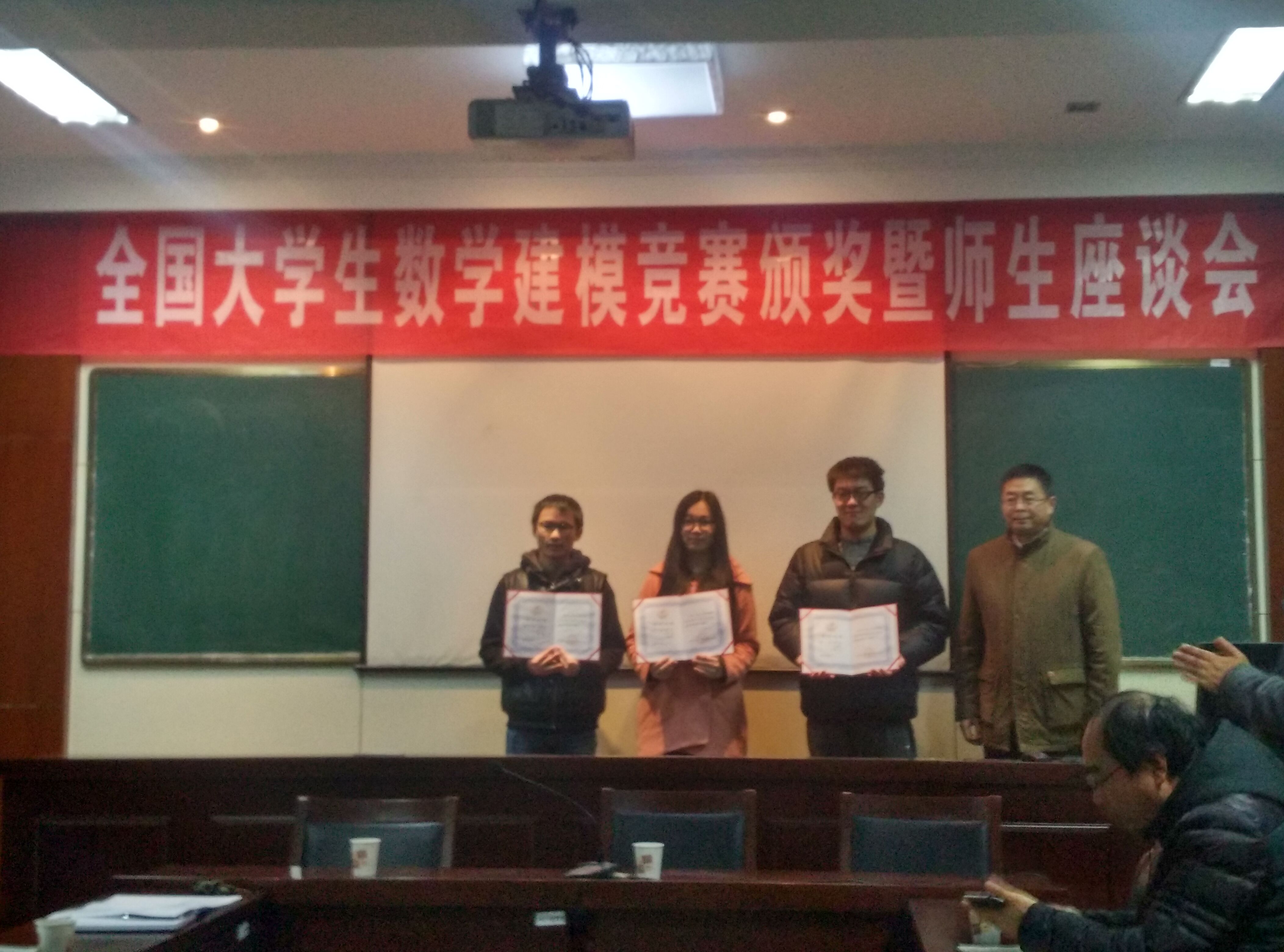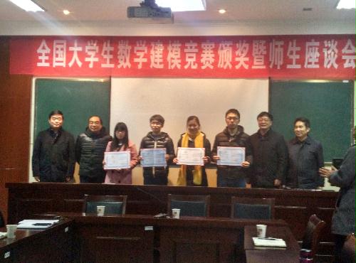 1月5日下午,学校在数学科学学院报告厅隆重举行全国大学生数学建模竞赛颁奖暨师生座谈会。副校长胡效亚教授、教务处刘永平副处长、相关学院的副书记、教学副院长、数学科学学院党政领导、数学建模全体指导老师以及2015年参加全国数学建模竞赛的获奖者参加了会议。