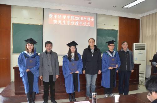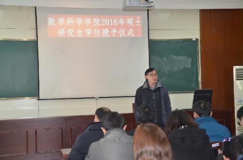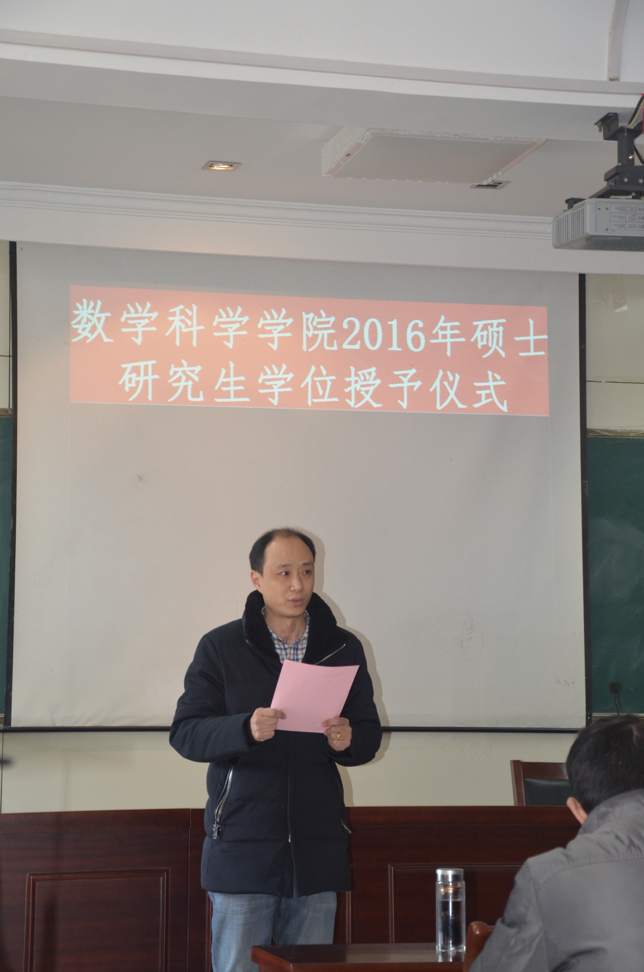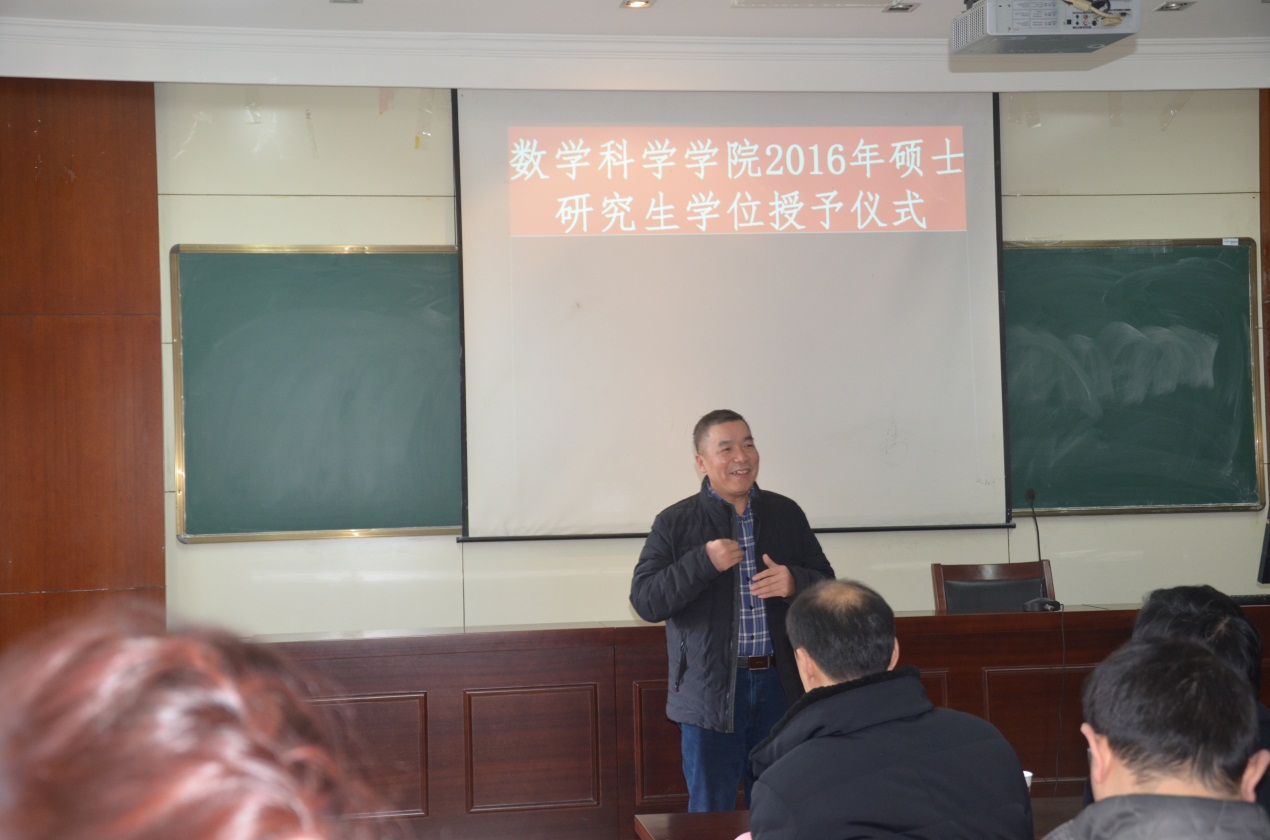 学位授予仪式于1月14日下午15时召开,授予仪式由学院党副书记朱鑫铨老师主持。首先全体起立,奏国歌。接着主持人朱鑫铨老师介绍了到场的各位领导和导师,然后由学院副院长凌智老师宣读了扬州大学2016年在职硕士研究生学位授予决定。伴着悠扬音乐学院学位委员会教师和导师代表为身着学位服、头戴学位帽的毕业生们颁发了学位证书。证书颁发完毕后导师代表朱家生老师代表学院全体教师送出最真挚的祝福;党委副书记朱鑫铨老师为本届校友联络员肖文斌同学颁发校友联络员聘书,并由毕业生代表肖文斌同学发言,表达了同届同学对母校共同的期望,希望母院越办越好。最后学院副院长李立斌老师讲话,他的话语慷慨激昂,对毕业生提出了殷殷期望,希望学子们能够秉承数学人踏实肯干、积极向上的斗志,牢记老师的重托;祝福全体毕业生在未来的征途中,始终秉承“坚苦自立”的校训精神,自强不息,志存高远,砥砺前行,勇攀高峰!声声寄语为大家送上了最深情的祝福和殷切的希望。