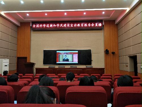 为学习贯彻党的十九大精神、“科技三会”精神和习近平总书记关于科学道德和学风建设的重要指示精神,学院11月围绕“学风建设”、“基础文明规范”、“宿舍班级文化建设”等方面组织开展基础文明建设月活动。14日,学院领导、教授导师、青年教师、研究生、本科生代表集中观看了由中国科协、教育部、中科院、社科院、工程院、自然科学基金会联合举办的2017年全国科学道德和学风建设宣讲教育报告会的直播。