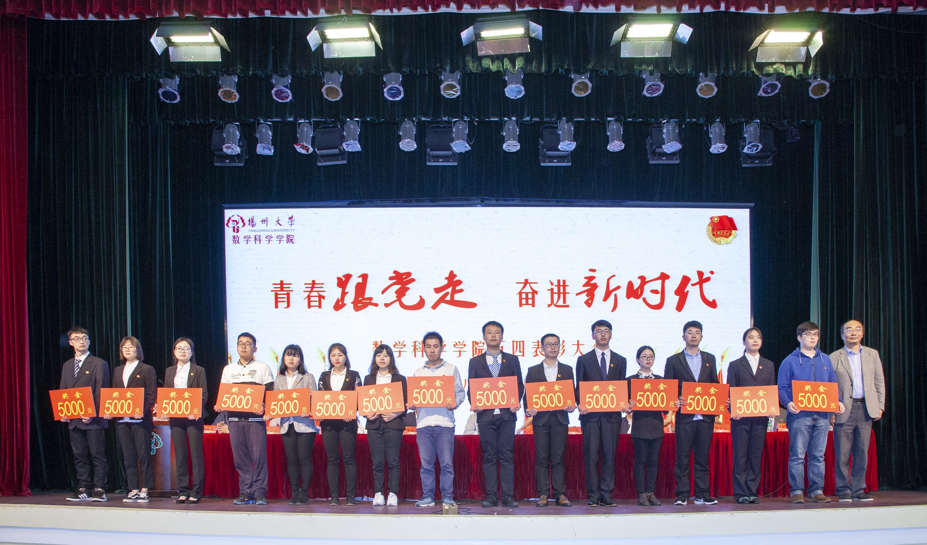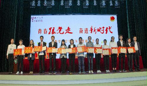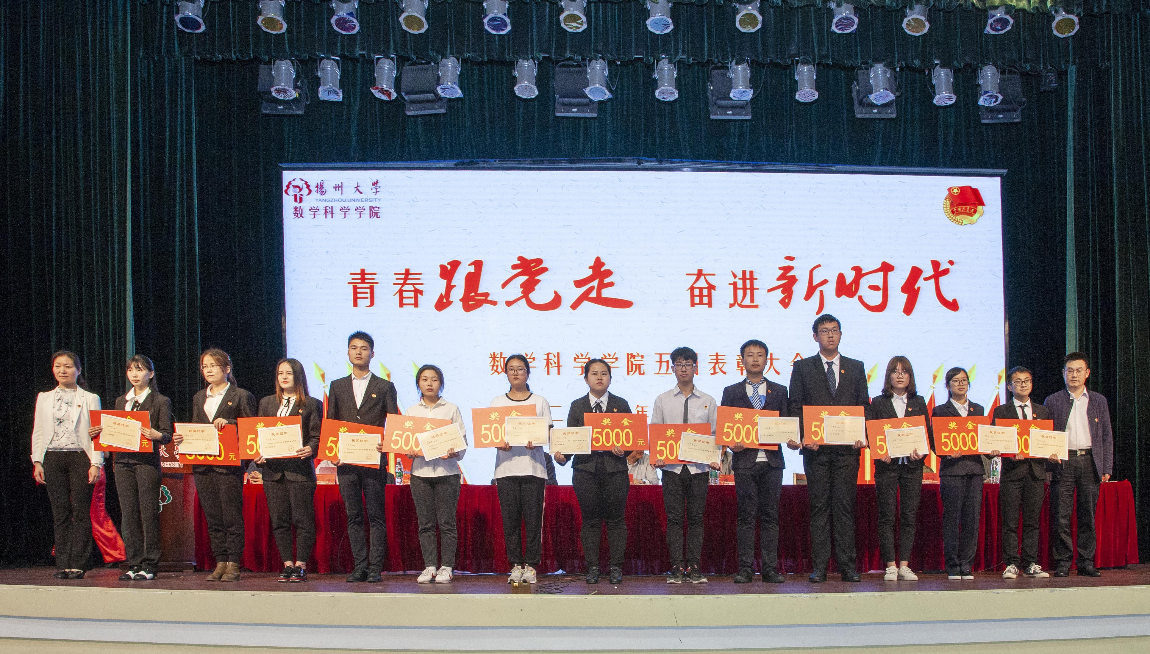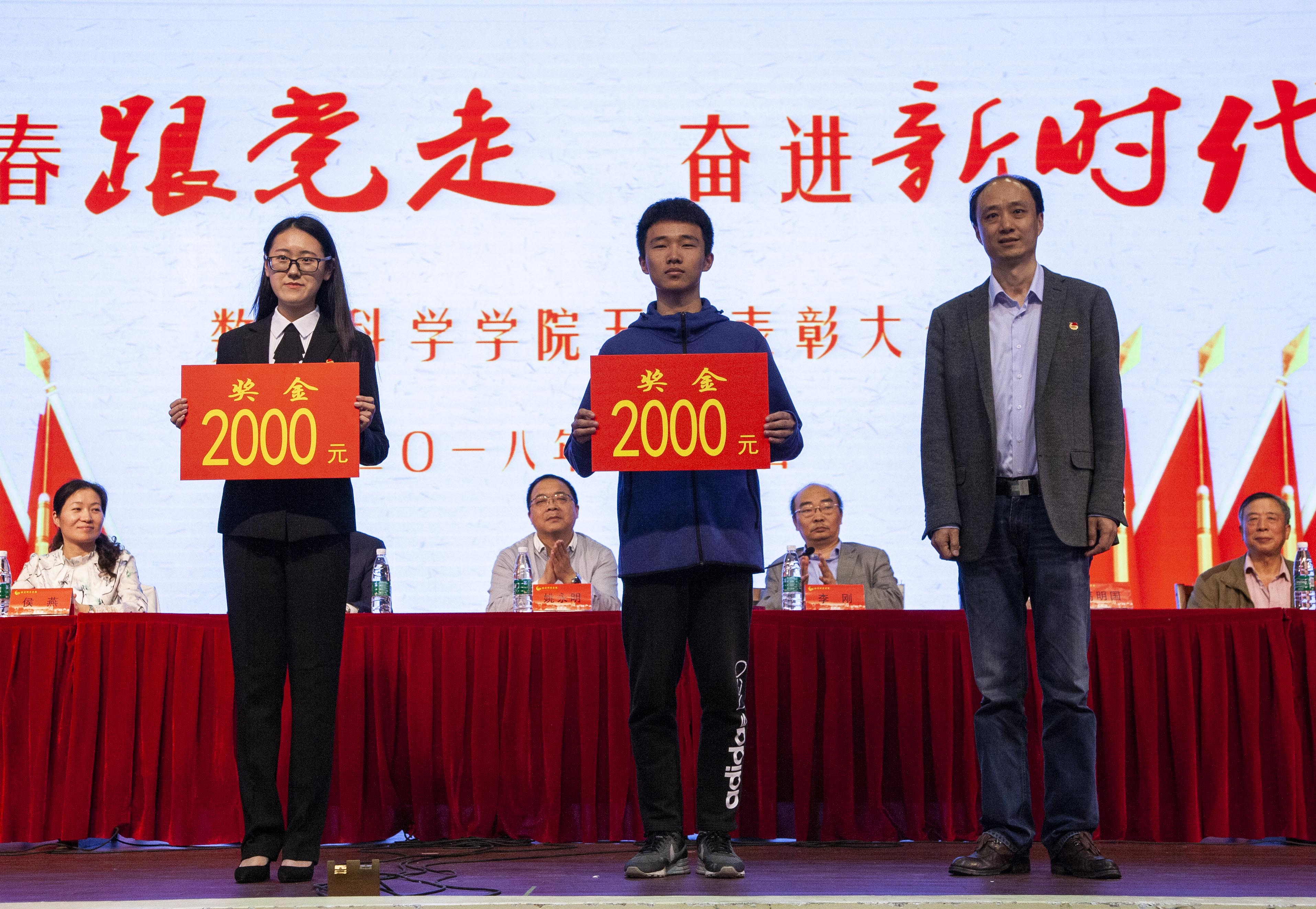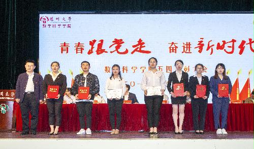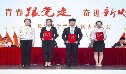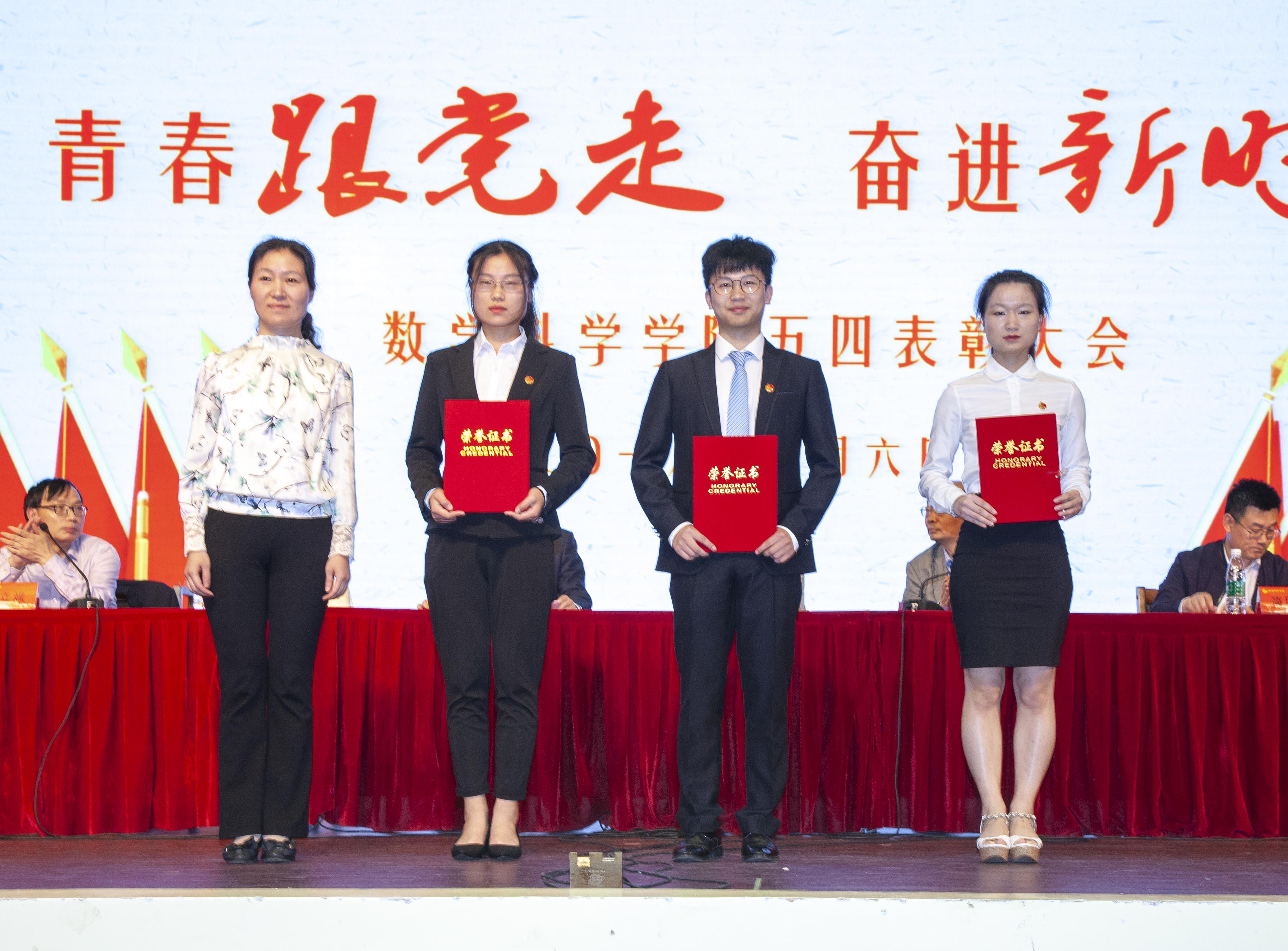此次活动的第一项议程—五四表彰大会在庄严的国歌声中拉开帷幕。首先副院长李立斌老师宣读了2017年度省级以上获奖名单,接着副院长凌智老师宣读了2017-2018学年数学科学学院“五四”系列表彰决定。宣读结束后,出席活动的嘉宾为获奖同学、支部代表与团队代表颁奖。